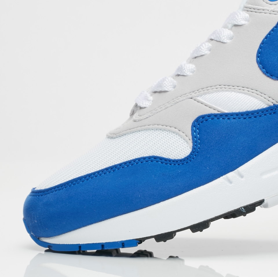 Чтобы отпраздновать 30-летие Air Max 1, Nike переиздал культовый силуэт в одной из его оригинальных цветовых гамм. Переиздание Nike Air Max 1 OG Anniversary Royal (2017 Restock Pair) имеет верх из белого нейлона с замшевыми накладками Neutral Grey и Game Royal. Кроссовки также имеют вставку Air в мидсоли и трехцветную подошву.