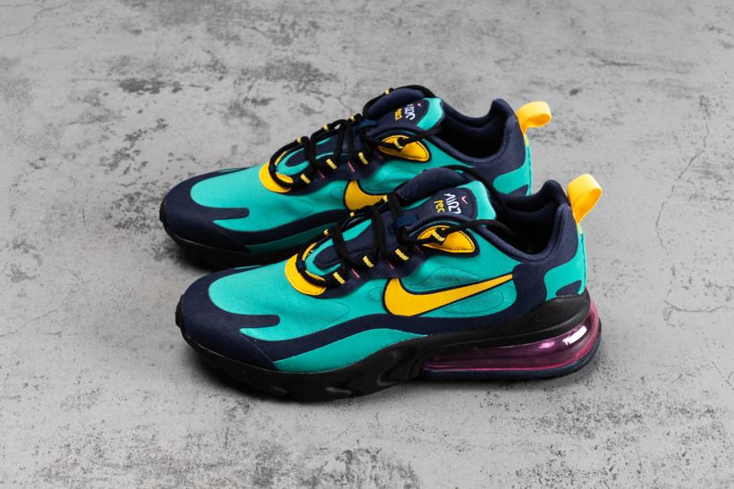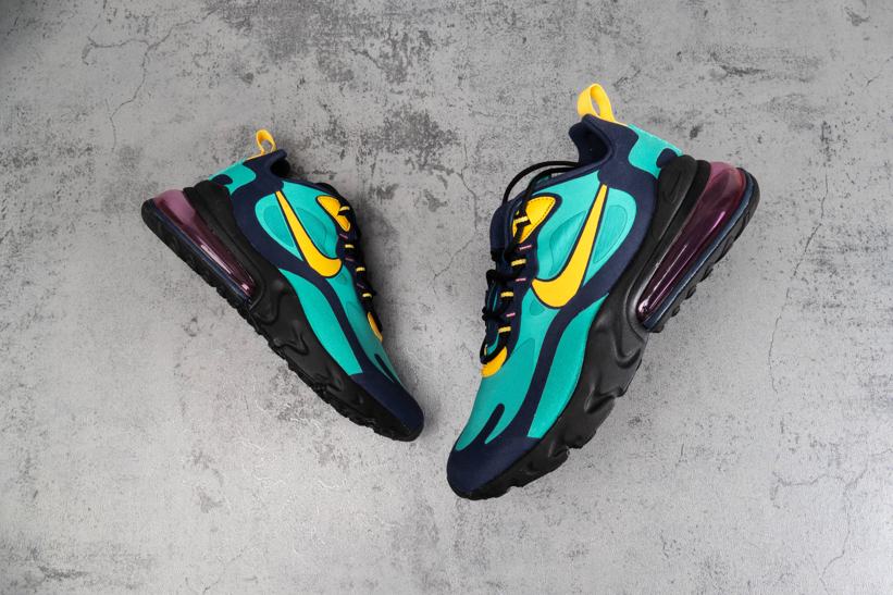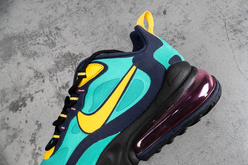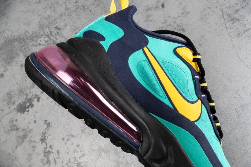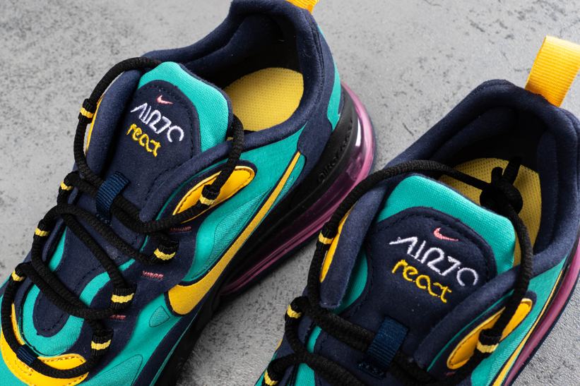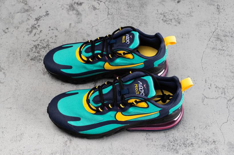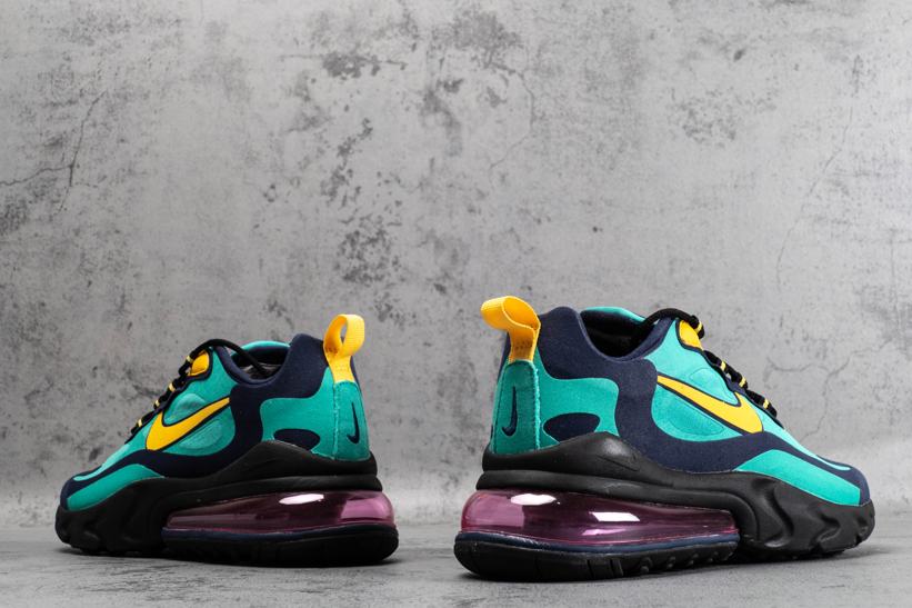 Nike Air Max 270 React включает в себя элементы из предыдущих моделей при разработке собственной эстетики. Модель «Pop Art», выпущенная в сентябре 2019 года, имеет потрясающую зеленую основу с волнистыми синими замшевыми накладками, простирающимися от носка до воротника. Желтая галочка бренда выделяется в средней части стопы и включает в себя акценты того же оттенка вдоль выступа вампа и пятки. Кроссовки отделаны пенопластовой мидсолью React и увеличенной системой 270 Max Air.- Цвета: Electro Green/Yellow Ochre-Obsidian