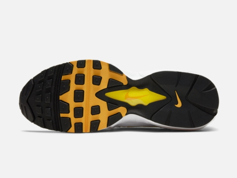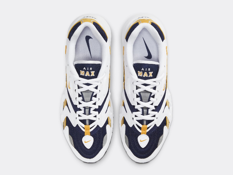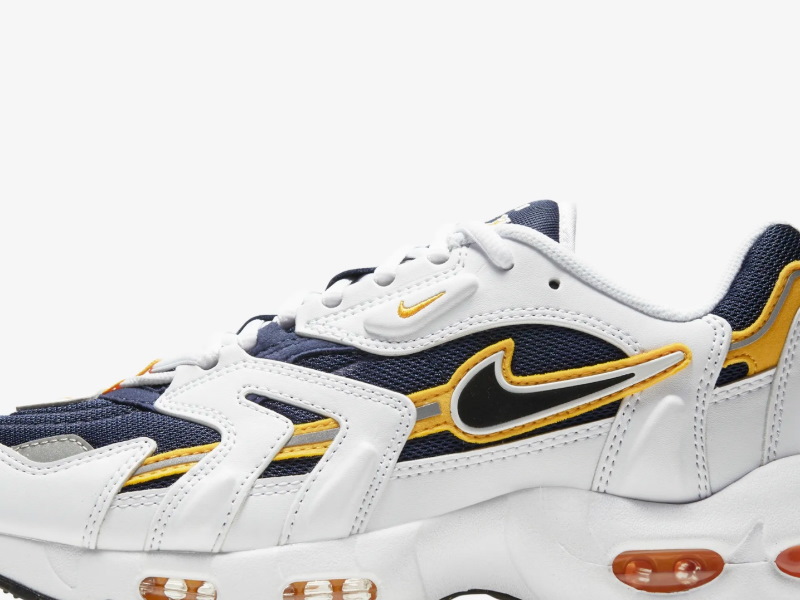 Рифленая темно-синяя сетка служит базовым слоем верха кроссовок и быстро подкрепляется прозрачными белыми кожаными накладками, большинство из которых имеют наклонную L-образную форму. Одноименный оттенок «Goldenrod» появляется на гоночной полосе, которая начинается с задней части брызговика, пересекает прорезиненный Swoosh в средней части стопы и останавливается на пятке. Внизу белая мидсоль из пеноматериала EVA окружает оранжевые блоки Air Max, немного уменьшенные в размерах по сравнению с выпуклыми пузырями оригинала. Двухцветная подошва завершает образ.- Цвет: White/Black/Midnight Navy