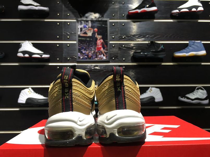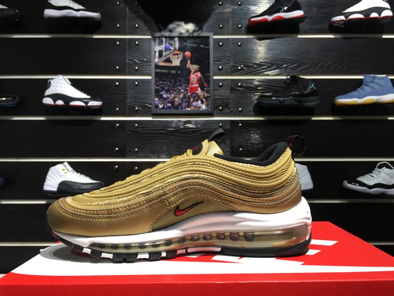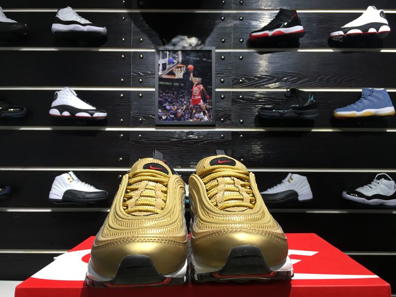 Заказать поиск кроссовок Nike Air Max 97 Metallic Gold с бесплатной доставкой. Классика никогда не выходит из моды, и металлическое золото Nike Air Max 97 доказывает это. Обладая полностью золотым верхом с красными и черными акцентами на язычке, детализацией языка и свушем в средней части стопы, верхняя часть цветовой гаммы в стиле драгоценных металлов компенсируется белой мидсолью с полноразмерным блоком Air Max 97, также поставляемым в золоте. Они появились на полках магазинов в мае 2018 года после успешного дропа в 2017 году и были доступны в розницу от 160 долларов. Ознакомьтесь с подробными фотографиями и закажите эту расцветку Nike Air Max 97 Metallic Gold в розничных магазинах или в сервисе Slamdunk