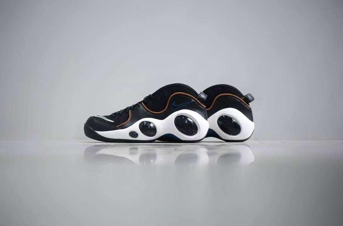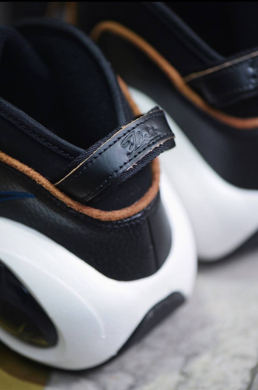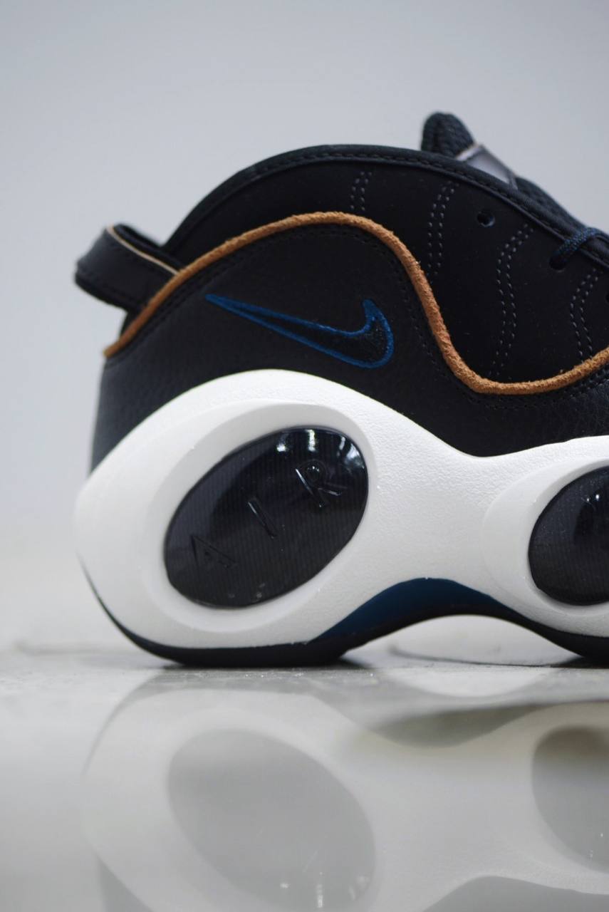 Nike Air Zoom Flight 95 'Black Valerian Blue' возрождает одну из первых баскетбольных моделей Nike, в которой была использована технология Zoom Air. В передней части кроссовка находится блок Zoom Air, а в пятке - амортизирующий блок Air-sole. Оба блока размещены в объемной подошве Phylon с фирменными "глазами жука", встроенными в боковую стенку. Верхняя часть выполнена из черного нубука с тональной строчкой и большим логотипом Swoosh, вышитым на носочной части. На черной накладке из кожи, украшенной контрастной синей строчкой, изображен боковой Swoosh.- Цвета: Black/Valerian Blue/Ale Brown