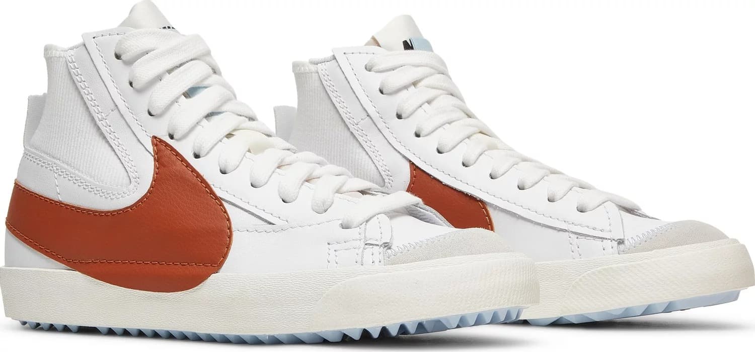 Nike Blazer Mid '77 Jumbo 'Dark Russet' обновляет ретро-силуэт с помощью преувеличенных деталей. Главные из них - увеличенный ярлык Nike на язычке из вспененного материала и огромный кожаный Swoosh, жгуче-оранжевый цвет которого выделяется на фоне белой кожи. Эластичный текстильный воротник обеспечивает удобную посадку, а кожаный язычок на пятке помогает легко надевать и снимать кроссовки. Под ногами ярко-синяя резиновая подошва с рельефным и увеличенным протектором "елочка".- Цвета: White/Dark Russet/White/Sail