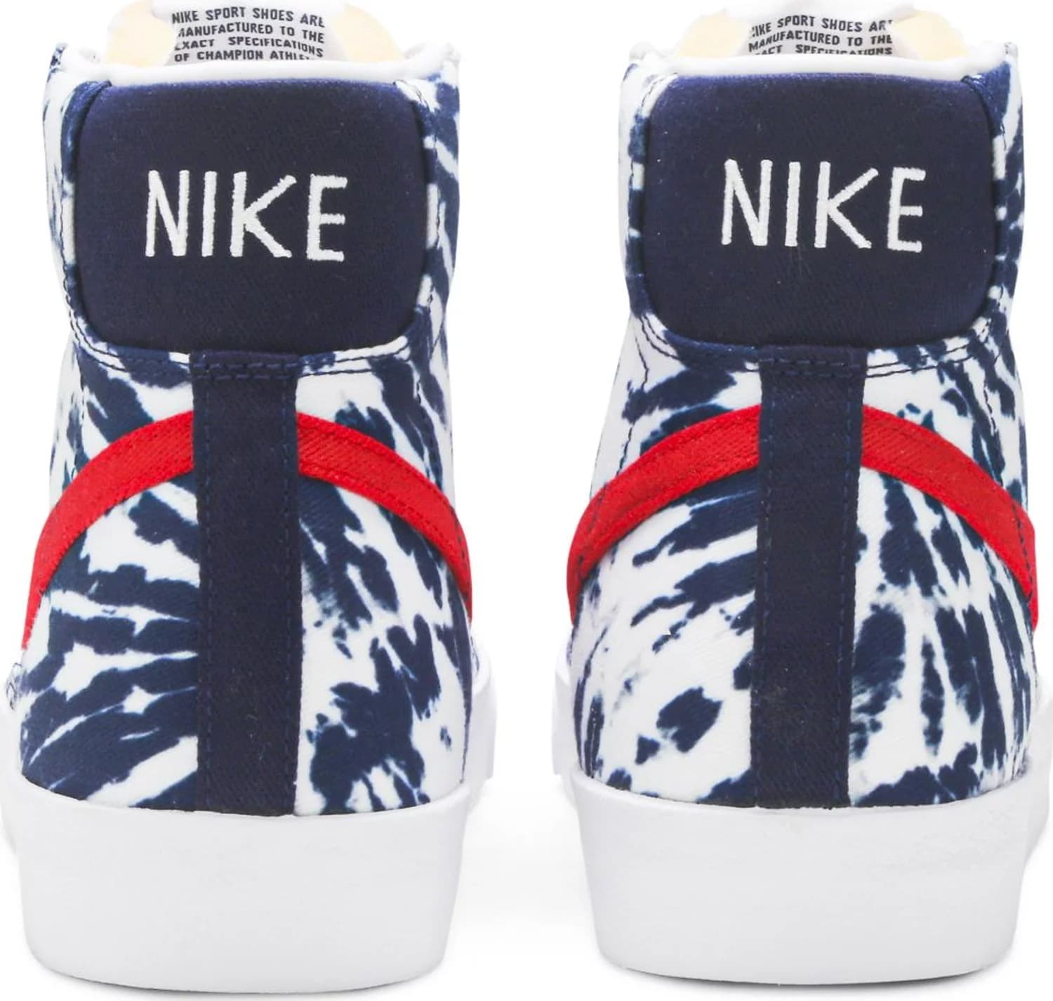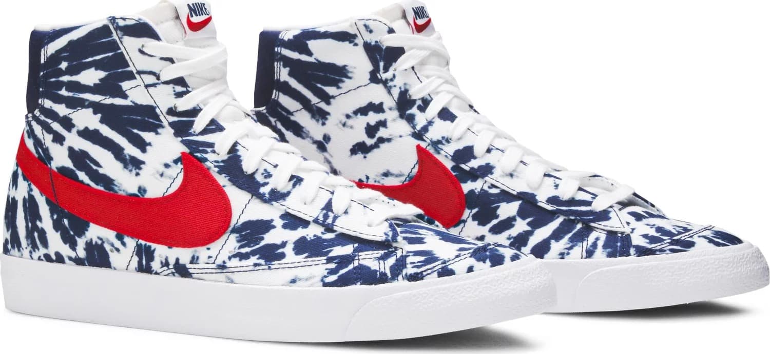 Nike Blazer Mid '77 Vintage "Blue Tie-Dye" демонстрирует психоделический принт на текстильном верхе кроссовок. На бело-голубом фоне выделяется тканевый Swoosh красного цвета University Red, а также меньший Swoosh на тканой бирке, украшающей язычок из пеноматериала. Ретро-силуэт опирается на слегка текстурированную резиновую подошву, которая переходит в подошву "елочка", обеспечивающую надежное сцепление с поверхностью.- Цвета: University Red/Blue Void/White