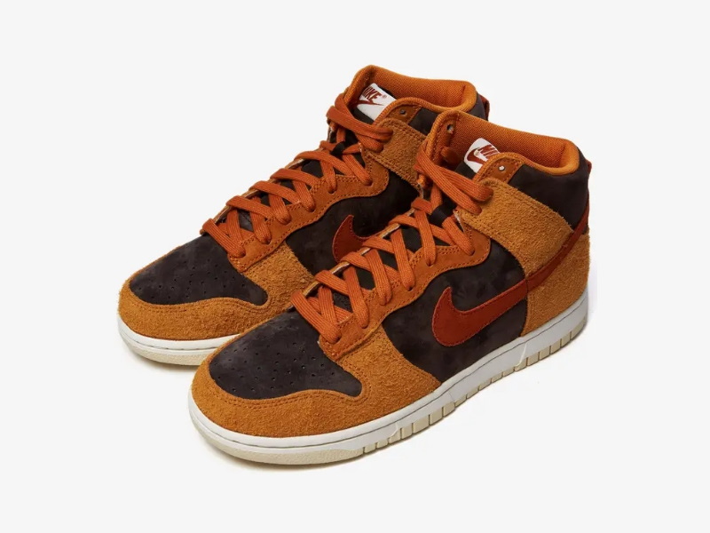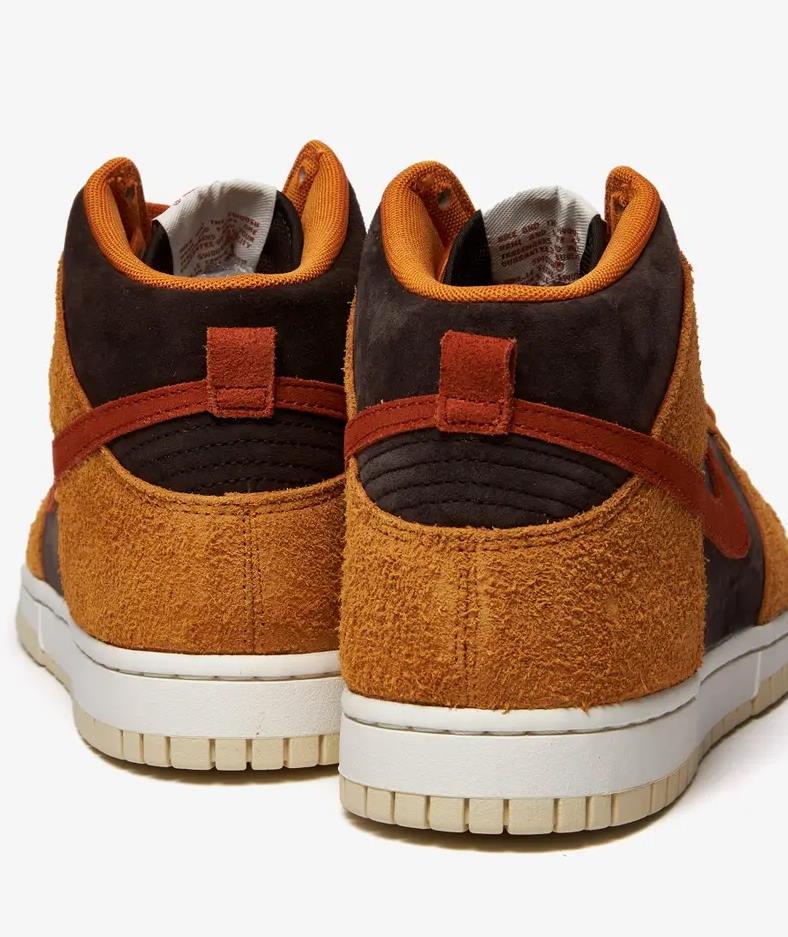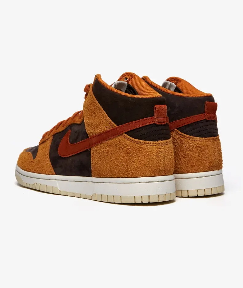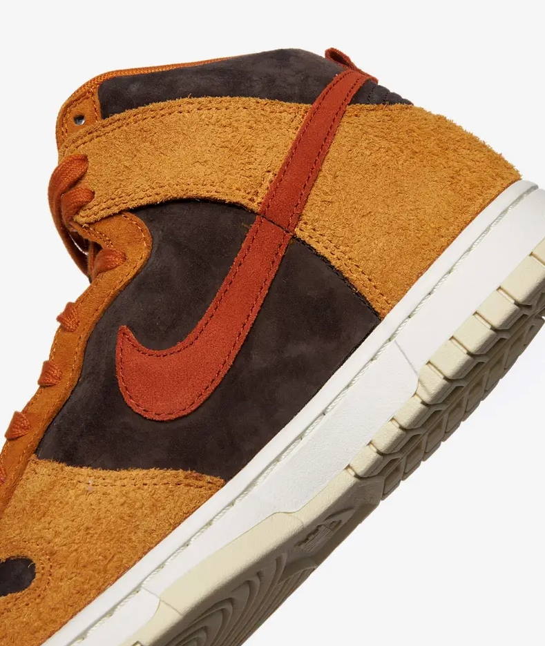 Nike Dunk High Premium «Dark Curry» демонстрирует теплые осенние тона на кроссовках, которые изначально использовались в качестве баскетбольной обуви в 1985 году, а спустя десятилетия вновь стали предметом уличной одежды. Верх из замши Velvet Brown с желто-оранжевым логотипом Swoosh и накладками из ворсистой замши цвета Dark Russet. Кроссовки установлены на прочной резиновой подошве.- Цвета: Velvet Brown/Dark Russet/Dark Curry/Sail