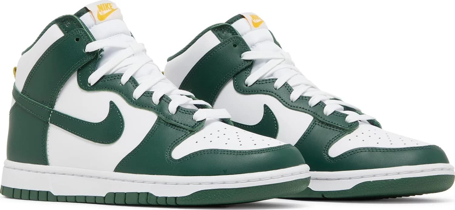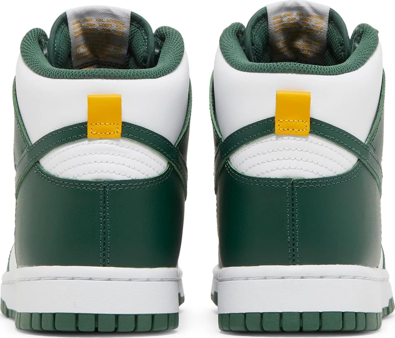 В модели Nike Dunk High Retro "Australia" классическая цветовая гамма сочетается с традиционной кожаной конструкцией. Выразительная палитра напоминает о национальных спортивных командах Австралии: белая основа, контрастные накладки благородного зеленого цвета, а также подобранный по цвету Swoosh. Тонкий желтый цвет присутствует на пятке и язычке с логотипом Nike. В основе кроссовок лежит стандартная резиновая подошва с белыми боковинами и зеленой резиновой подметкой, предназначенной для сцепления с паркетом.