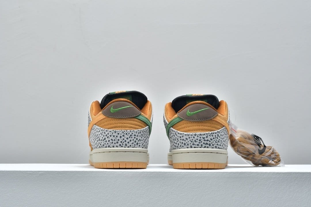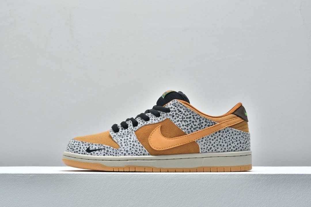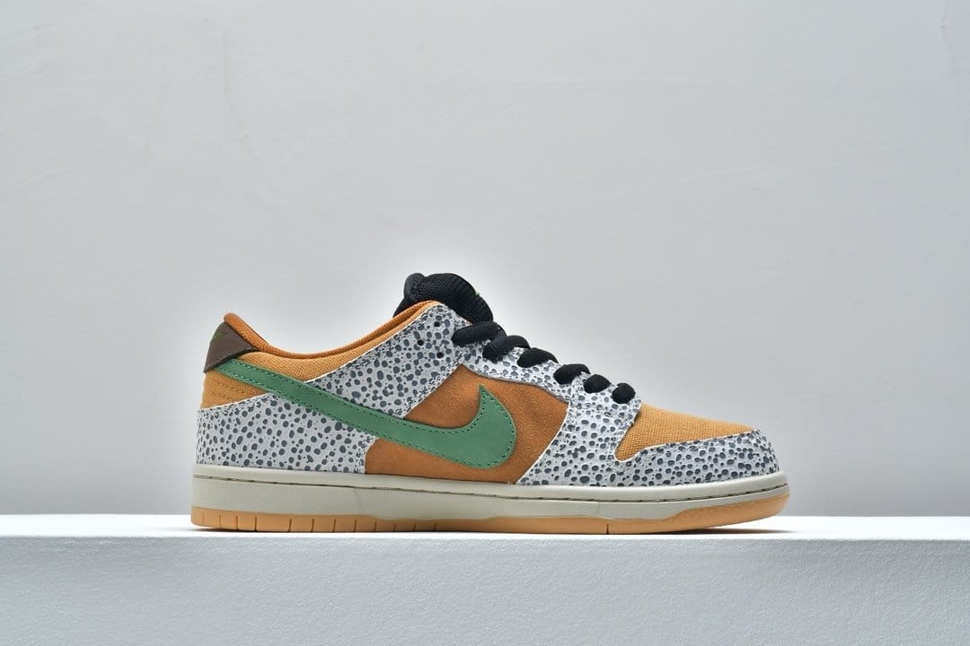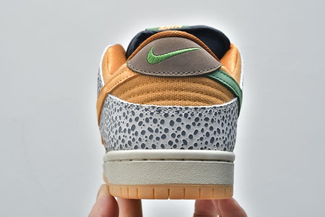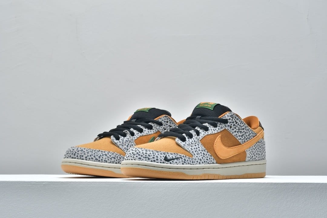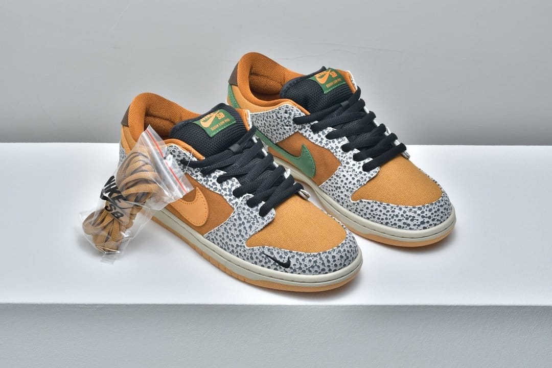Nike Dunk Low Pro SB Safari заимствует страницу дизайна из коллаборации Atmos Air Max 1 2003 года. Как и в его предшественнице, в конструкции используется оранжевый холст и замшевый верх, подчеркнутые несоответствующими оранжевыми и зелеными свушами на каждой обуви и накладки с принтом Safari, вышитые мини-галочкой сбоку в передней части стопы.- Цвет: Neutral Grey/Kumquat/Desert Ochre