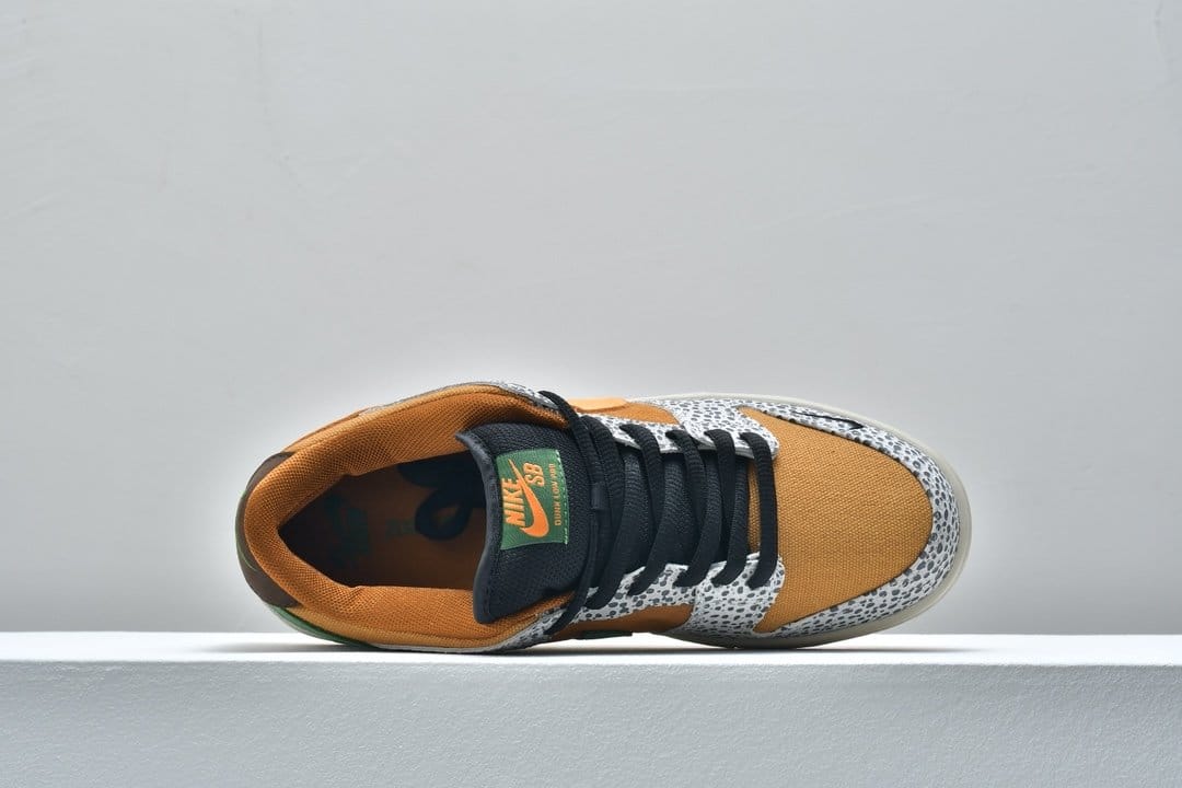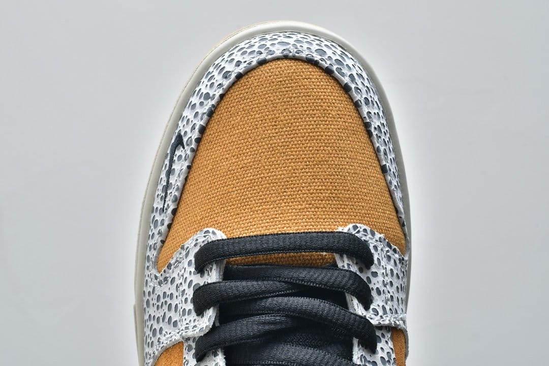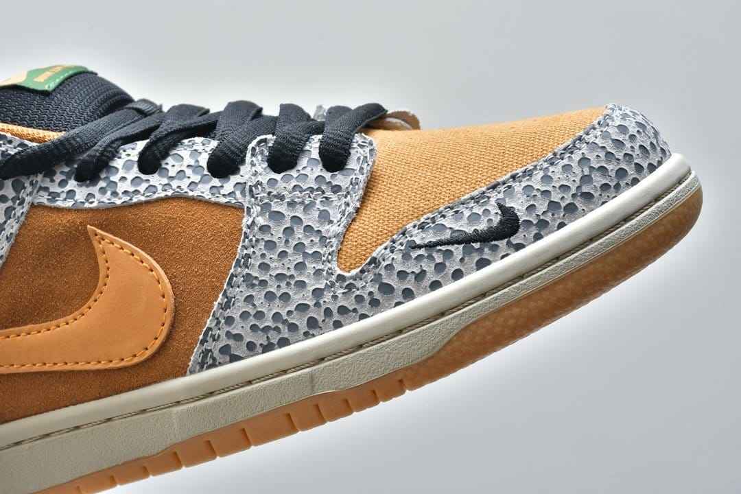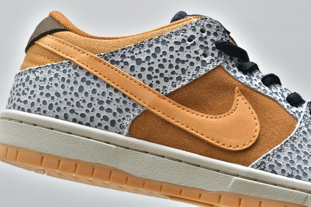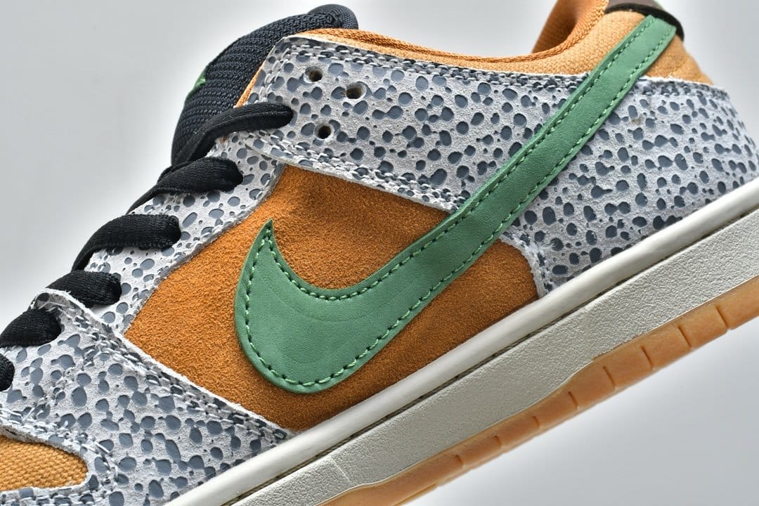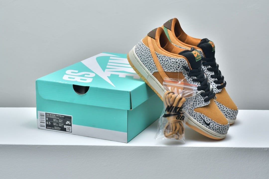 Nike Dunk Low Pro SB Safari заимствует страницу дизайна из коллаборации Atmos Air Max 1 2003 года. Как и в его предшественнице, в конструкции используется оранжевый холст и замшевый верх, подчеркнутые несоответствующими оранжевыми и зелеными свушами на каждой обуви и накладки с принтом Safari, вышитые мини-галочкой сбоку в передней части стопы.- Цвет: Neutral Grey/Kumquat/Desert Ochre