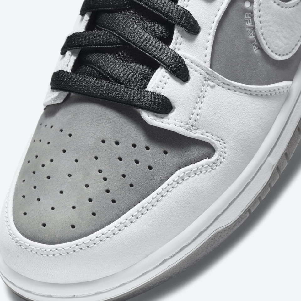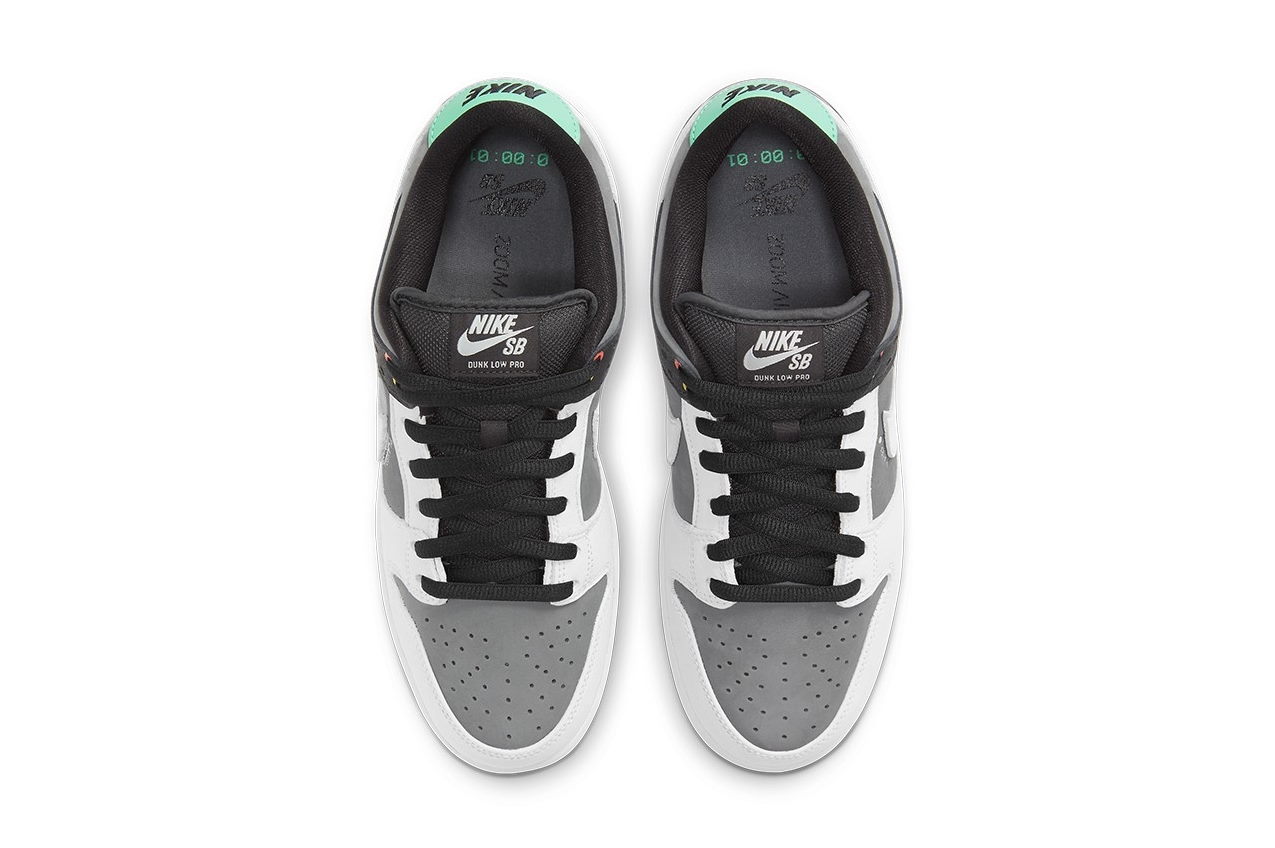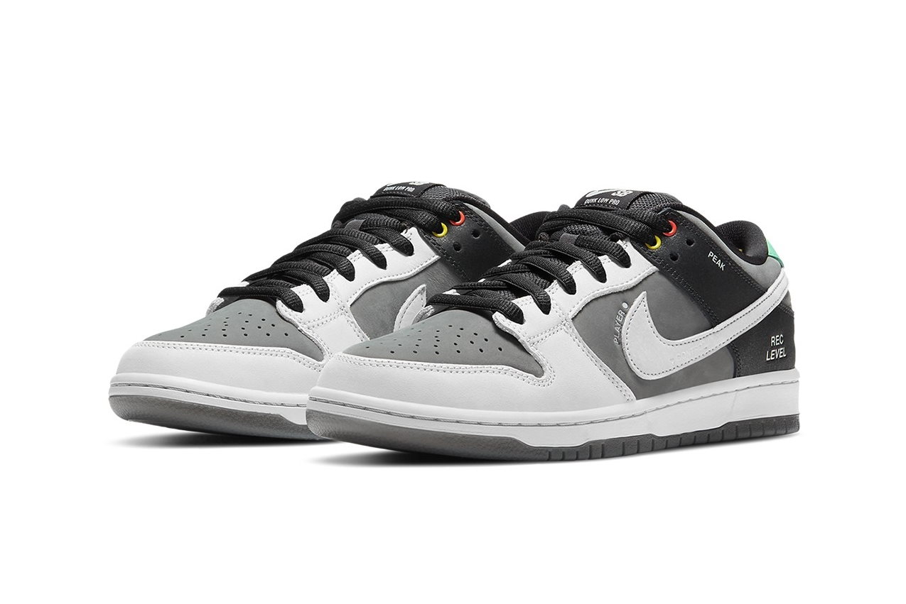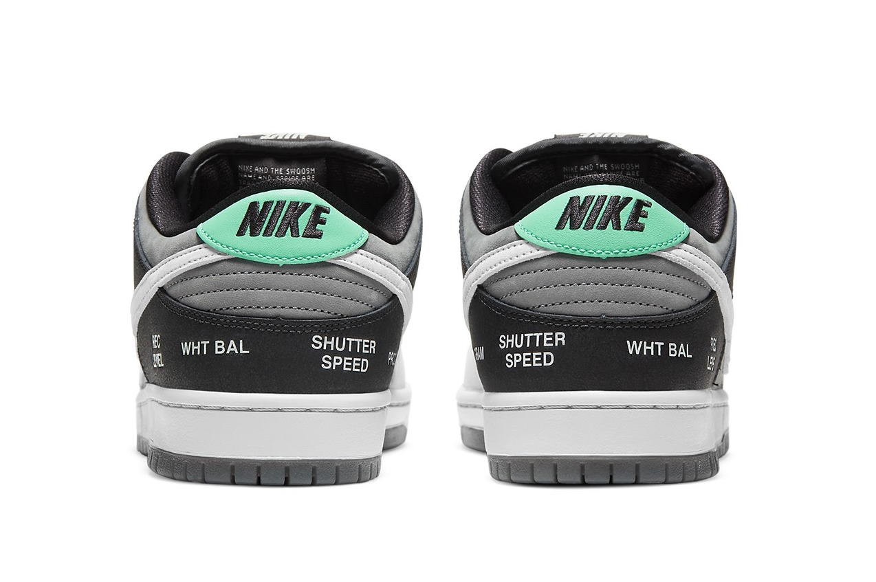 Кроссовки Nike Dunk Low SB Camcorder с низким верхом из темно-серого нубука с более светлым оттенком серого на накладке на переднюю часть стопы и фирменным логотипом Swoosh. Черная накладка на заднике из синтетической кожи украшена надписями «ВЫДЕРЖКА» и «УРОВЕНЬ ЗАПИСИ». Красные и желтые люверсы, а также мятно-зеленый язычок на пятке придают нейтральной цветовой гамме легкие акценты.