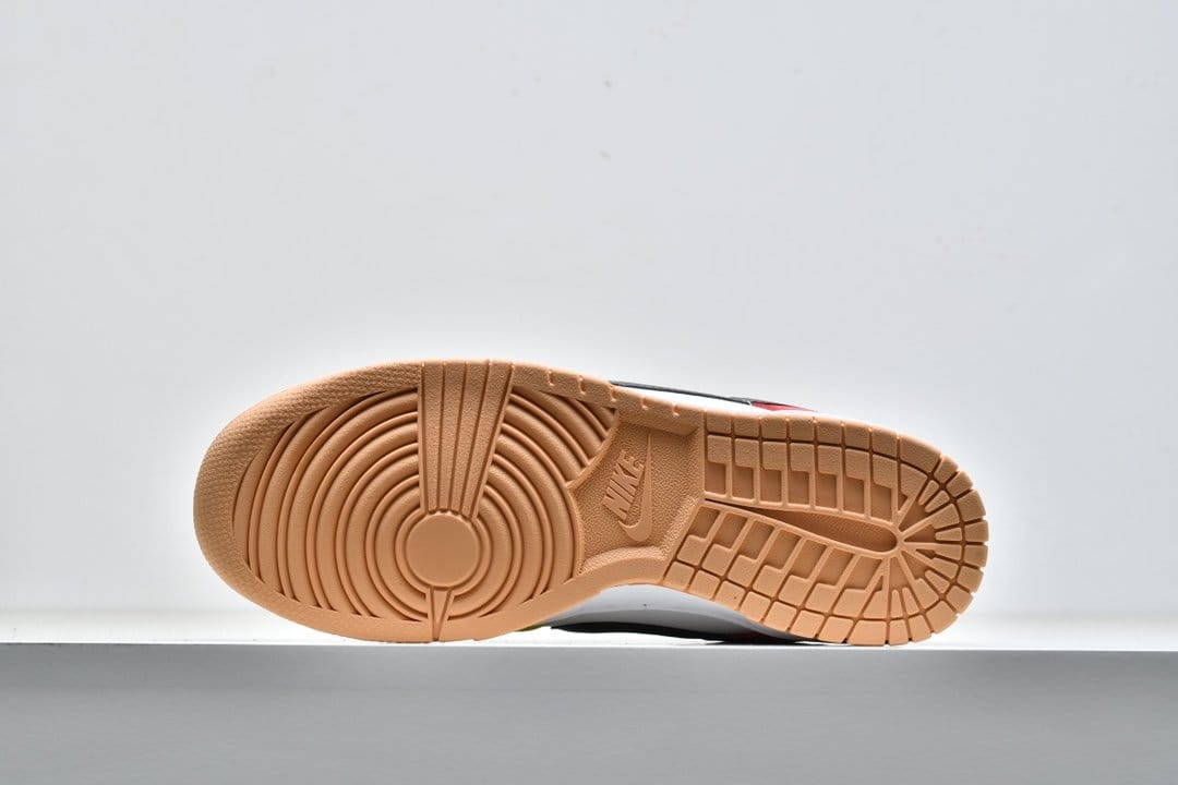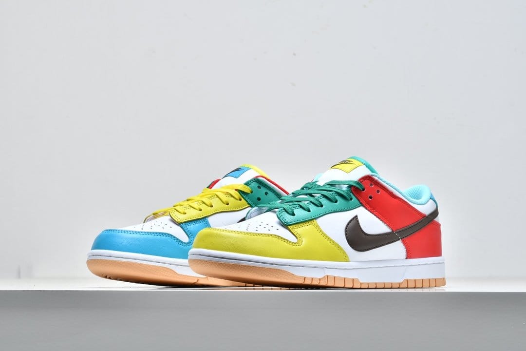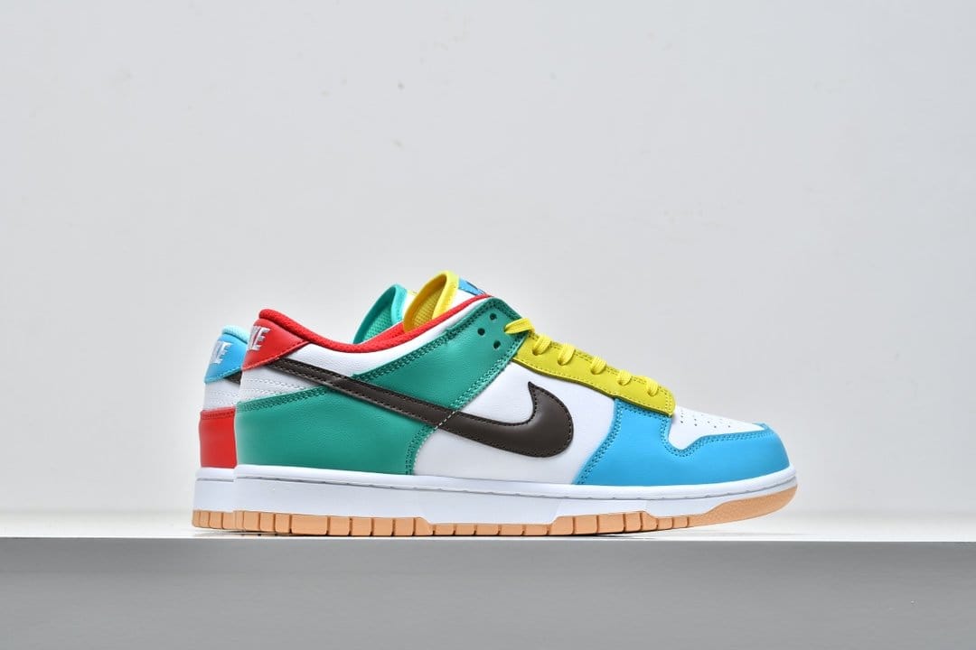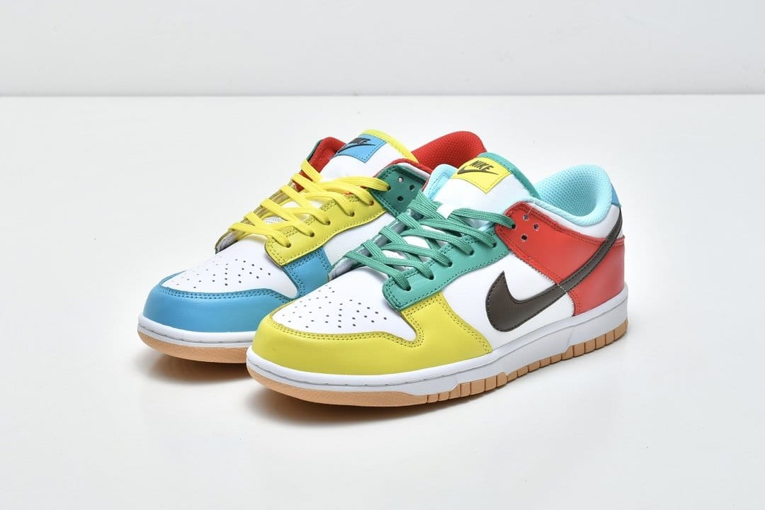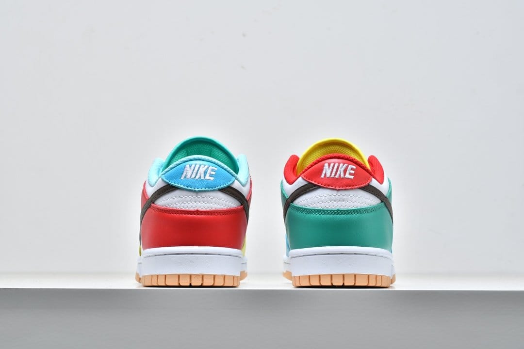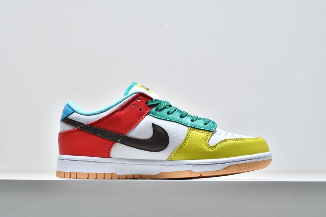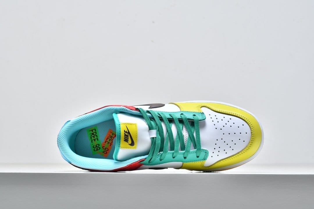 Nike Dunk Low SE «White», входящий в комплект Free.99, отличается несоответствующей цветовой блокировкой левой и правой обуви. Смешанные оттенки, представляющие собой диссонирующее сочетание красного, зеленого, желтого и пудрово-синего, контрастируют с белой кожаной основой, соответствующим белым текстильным язычком и коричневым кожаным логотипом Swoosh. Белая мидсоль и резиновая подошва персикового цвета завершают дизайн.