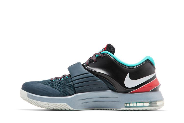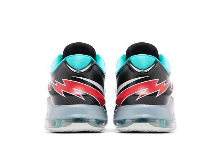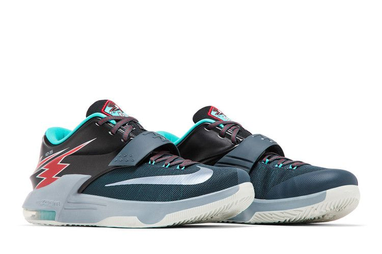 Фирменные кроссовки Кевина Дюранта KD 7 получили электрическое обновление в 2015 году. Модель KD 7 "Thunder Bolt" имеет черный низкий верх с сетчатой поверхностью и неоново-синими акцентами на тросах Flywire. Кроссовки также могут похвастаться черными кожаными деталями на боковых панелях и красными молниями, обвивающими пятку. Голубенькая серая подошва Zoom приглушенно контрастирует, а видимый блок Air Sole в пятке обеспечивает амортизацию.