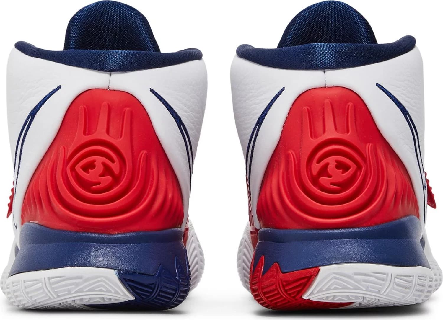 Nike Kyrie 6 "USA" - это шестая фирменная обувь Кайри Ирвинга, выполненная в патриотическом стиле, с белым верхом из сетки и кожи с контрастными синими и красными акцентами. Последний оттенок использован на формованной части пятки и регулируемом ремешке в средней части стопы, что обеспечивает дополнительную поддержку и фиксацию. Верх кроссовок опирается на мягкую подошву из вспененного материала, а в передней части кроссовка расположен блок Nike Air Zoom Turbo, обеспечивающий эффективную амортизацию.- Цвета: White/White/University Red/Midnight Navy