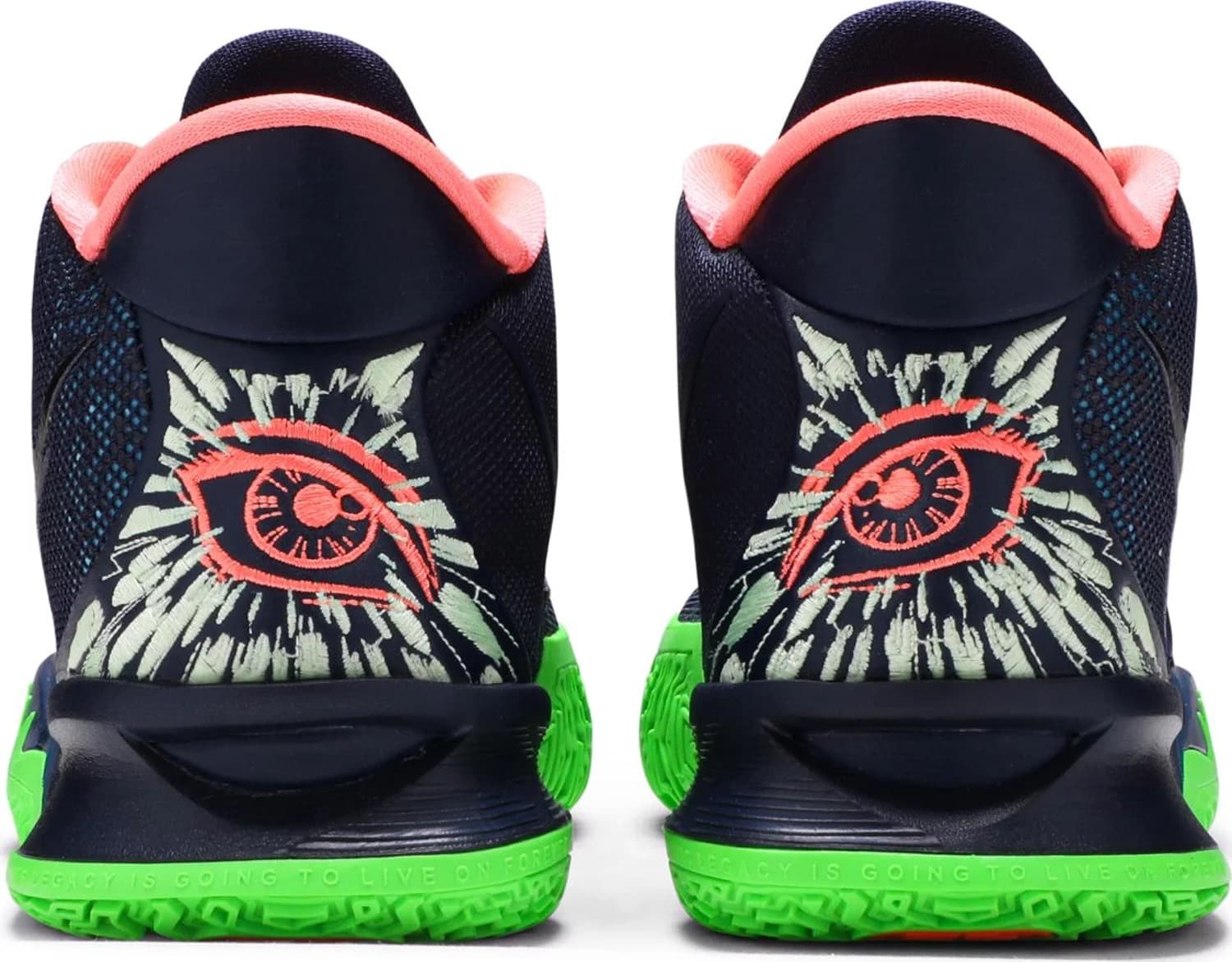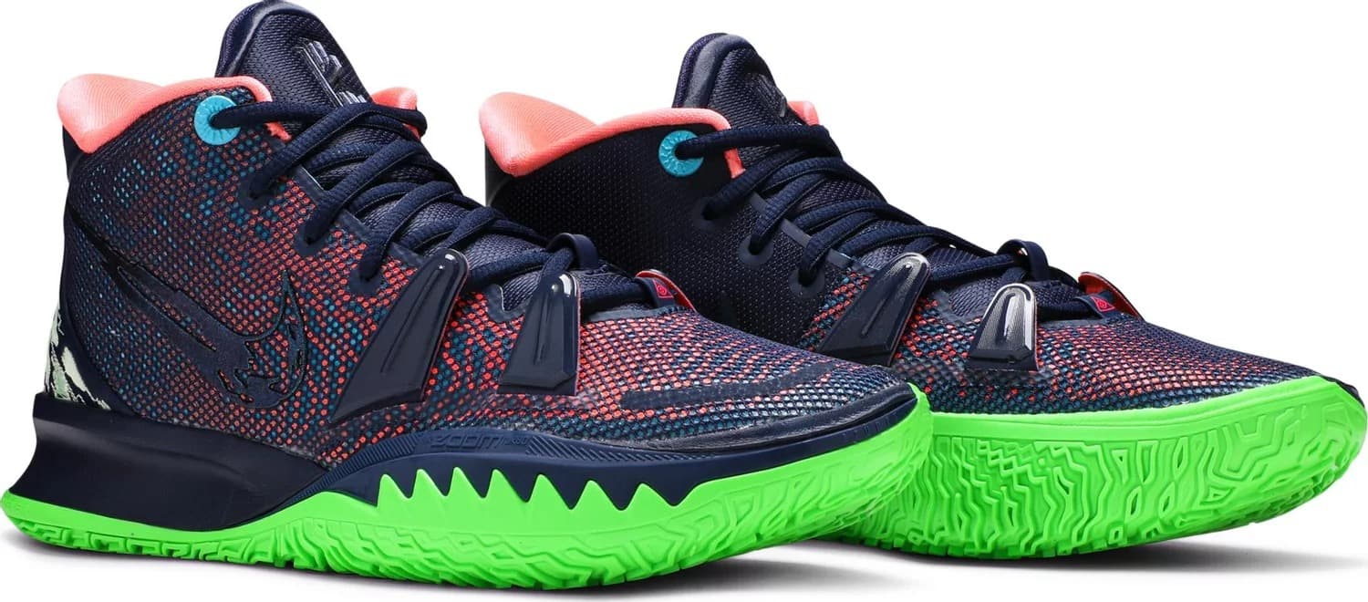 Nike Kyrie 7 'Midnight Navy' оживляет кроссовки для баскетбола яркими цветами и динамичной графикой. Открытая сетчатая конструкция кроссовок демонстрирует контрастирующие красные и синие тона на текстильной подкладке, а панель пятки представляет собой модифицированную версию всевидящего глаза Кайри Ирвинга, окруженную смелыми линиями. Мидсоль Phylon, в которой находится блок Air Zoom Turbo в передней части стопы, поддерживается подметкой из флуоресцентной зеленой резины.- Цвета: Midnight Navy/Midnight Navy/Lagoon Pulse