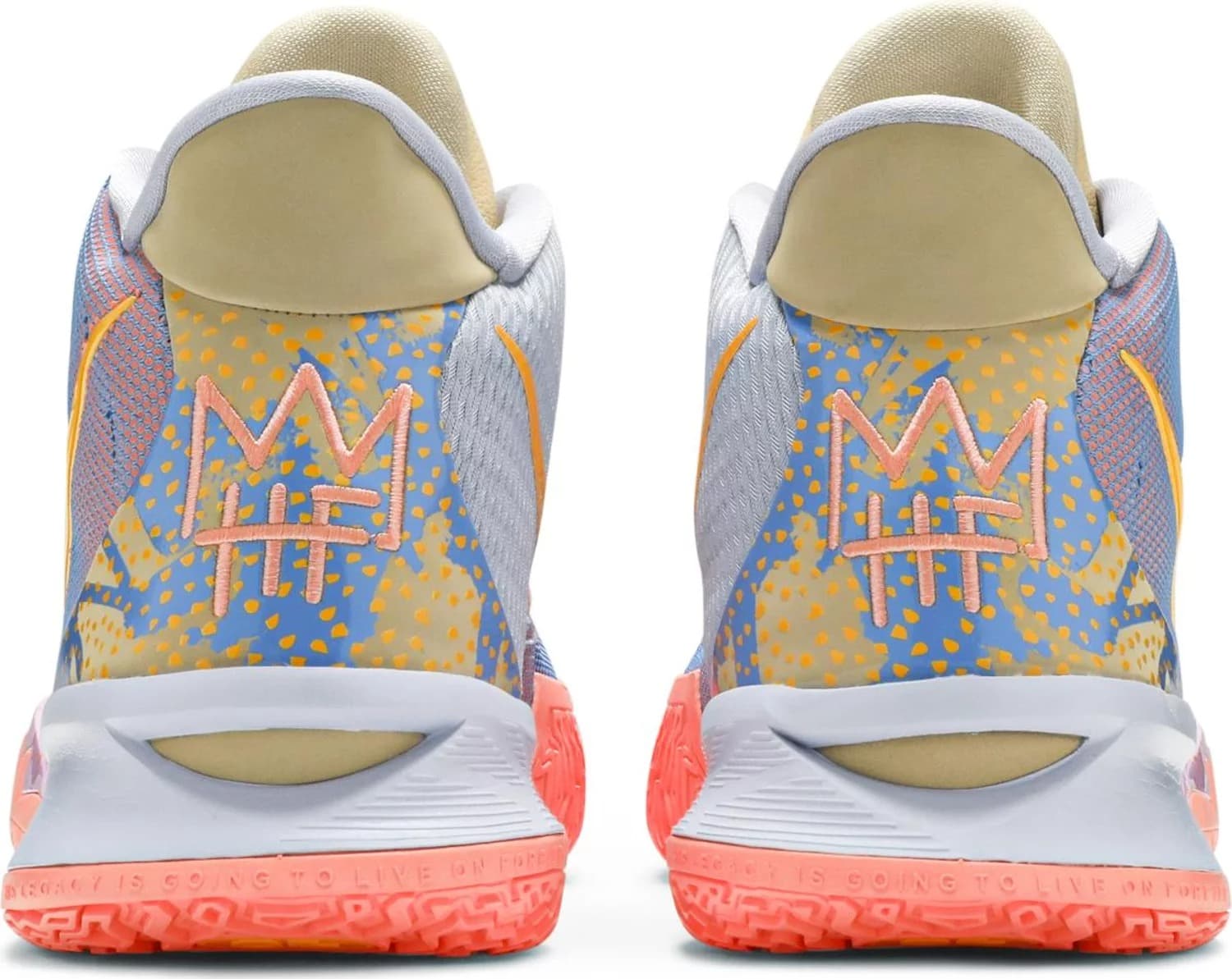 Nike Kyrie 7 Preheat "Expressions", одна из четырех стартовых расцветок седьмых фирменных кроссовок Кайри Ирвинга, отличается красочным дизайном, вдохновленным любовью спортсмена к искусству и творческому самовыражению. Открытый сетчатый верх демонстрирует многоцветный рисунок, напоминающий мазки кисти, а язычок выполнен в нейтральном оттенке, имитирующем черный холст. На накладке на пятке корона в стиле Баския расположена на вышивке "HF", сокращенно "Happy Family".- Цвета: Ghost/Laser Orange/Blue Beyond