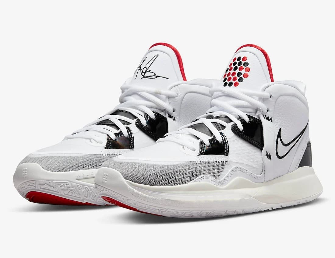 Nike Kyrie 8 Infinity EP Man Machine представляет собой базовую расцветку восьмой фирменной обуви Кайри Ирвинга, с разноцветным сетчатым верхом, облегчающим вес и обеспечивающим дышащую поддержку. Контрастный цвет подчеркивает блок Air Zoom Turbo в передней части стопы, профиль которого обеспечивает повышенную отзывчивость и ощущение корта. Под стопой на фирменной резиновой подошве используется инновационный рисунок сцепления.- Цвета: White/Black/University Red