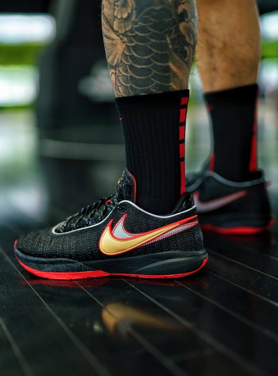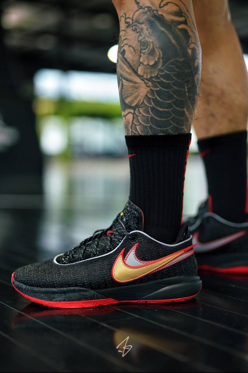 Модель Nike LeBron 20 "Trinity" имеет знакомую цветовую палитру, которая отсылает к временам Леброна Джеймса в Майами. Обтекаемый силуэт имеет черный трикотажный верх с контрастной белой отделкой вокруг воротника и кружевной части. В дополнение к кружевным украшениям 'XX', уникальные элементы брендинга включают перекрывающиеся Swooshes золотого и серебряного цвета. Тональный принт на боковом щитке изображает чемпионское кольцо Леброна 2012 года, расположенное среди густых пальмовых ветвей. Легкая амортизация обеспечивается черной подошвой Cushlon с пружинящими блоками Zoom Air в носочной и пяточной частях. На малиновой резиновой подошве видна пластина хвостовика из углеродного волокна и фирменный логотип ЛеБрона Dunkman под пяткой.- Цвета: Black/Black/University Red/University Gold/Light Smoke Grey