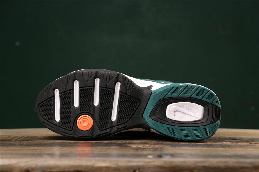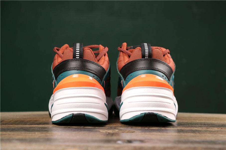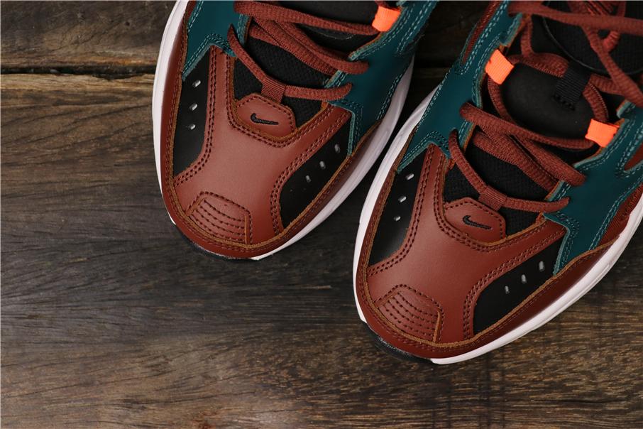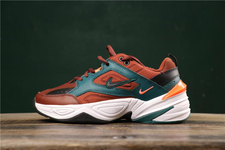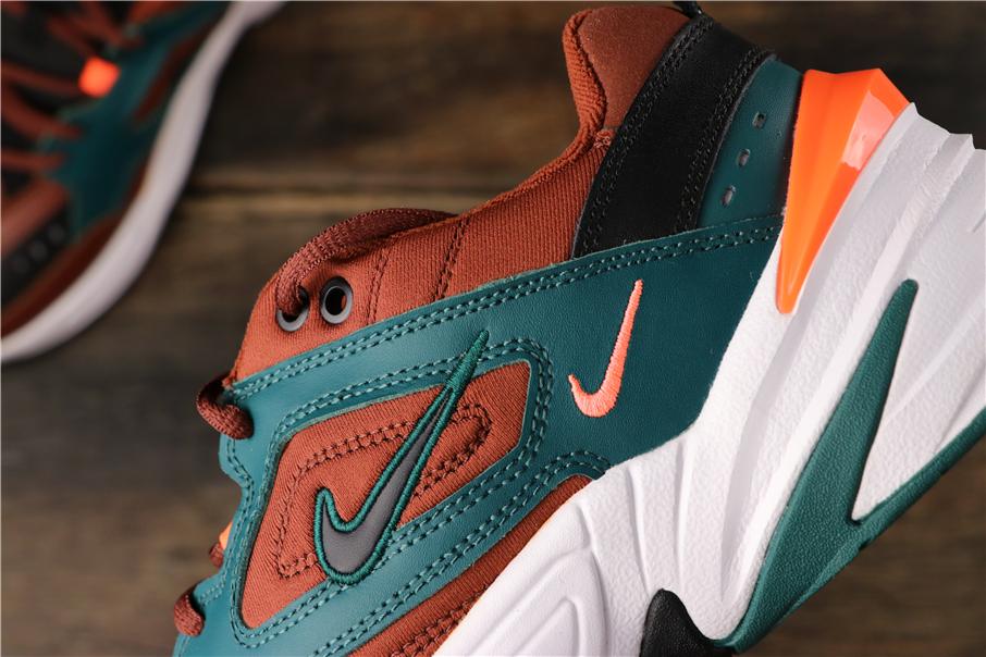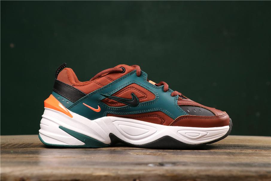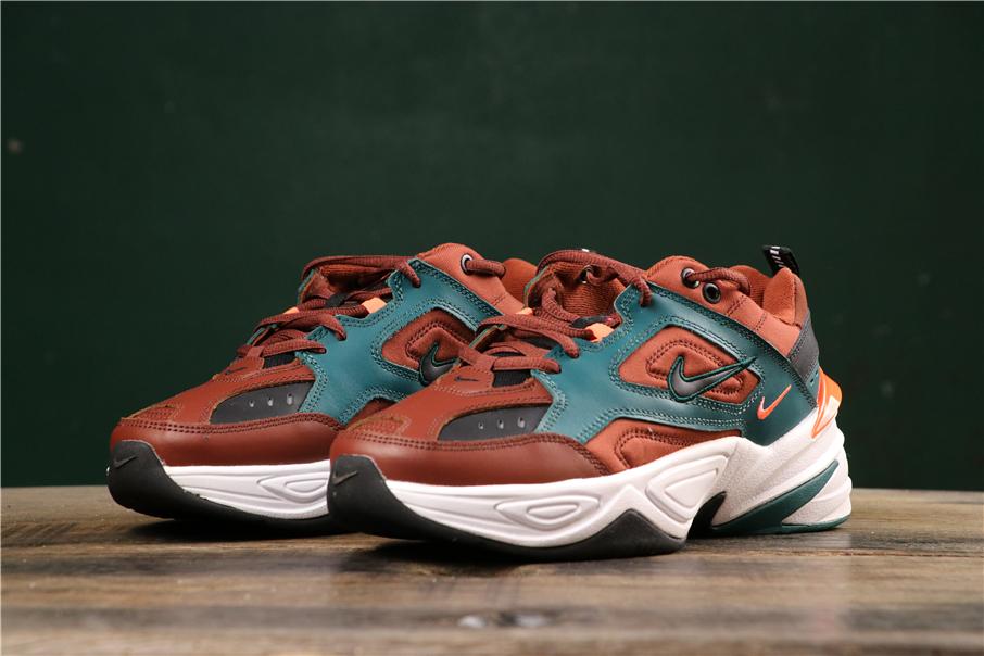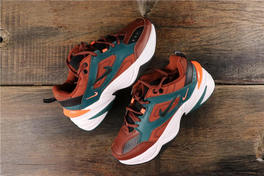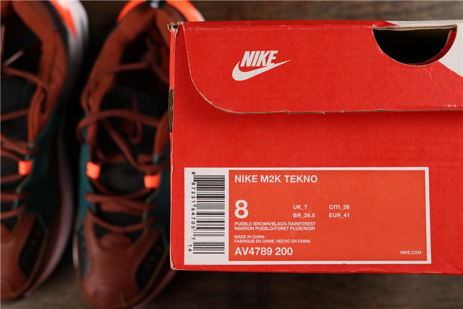 Верх модели выполнен из кожи цвета Pueblo Brown с зеленой накладкой на середине. Черные хиты видны на пальцах, сетчатом языке, каблуке и дополнительный мини-Swoosh на четверти. Дополнительно - яркие вставки цвета манго на зажиме для пятки. Ищите эту версию Nike M2K Tekno, которая дропнута в ноябре 2018 по цене от 100 долларов.- Цвета: Pueblo Brown/Rainforest-Bright Mango-Black