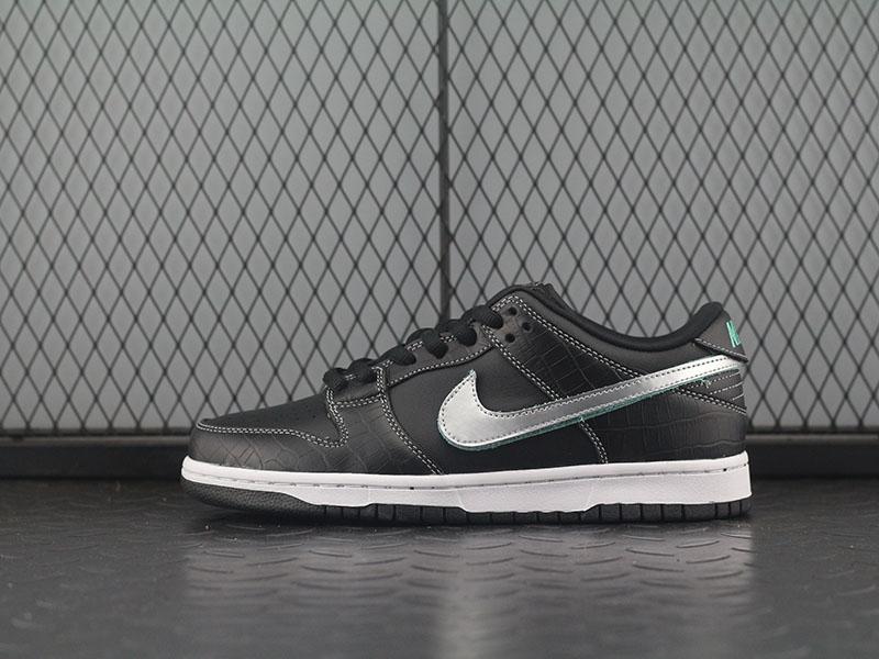 Заказать поиск кроссовок Nike SB Dunk Low Diamond Supply Co Black Diamond с бесплатной доставкой. Модель Nike SB Dunk Low Diamond Supply Co Black Diamond выпущена в ноябре 2018 года. Кроссовки представляют собой черный кожаный верх, с акцентами в виде "крокодила" и контрастной белой строчки. Съемный Swoosh в серебристом металлике оборачивается вокруг пяток и прикреплен липучкой цвета морской волны. Черно-белая подошва гармонично завершает силуэт. Ознакомьтесь с подробными фотографиями и закажите эту расцветку Nike SB Dunk Low Diamond Supply Co Black Diamond в розничных магазинах или в сервисе Slamdunk