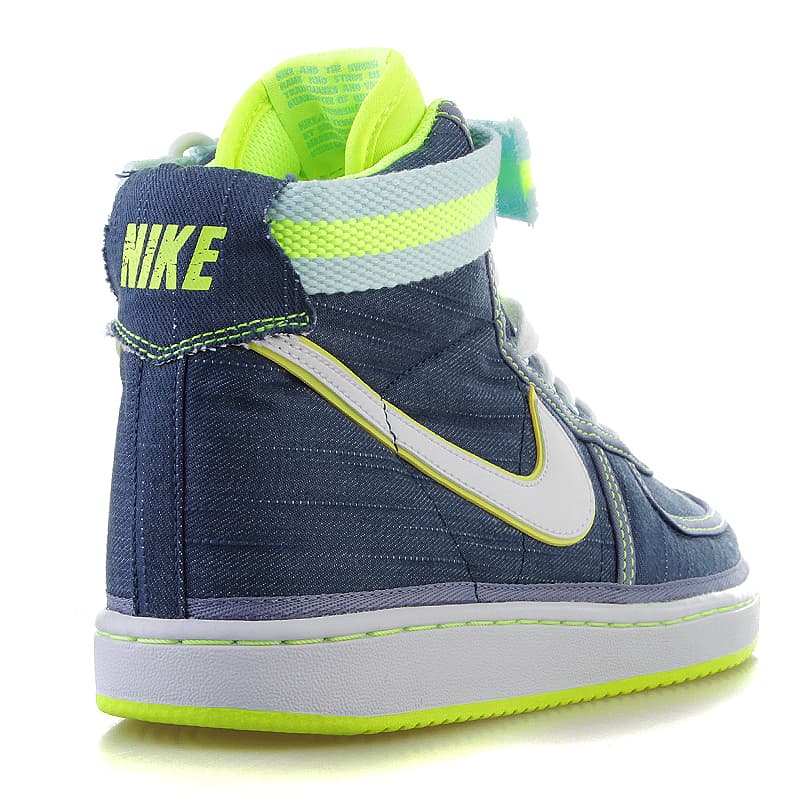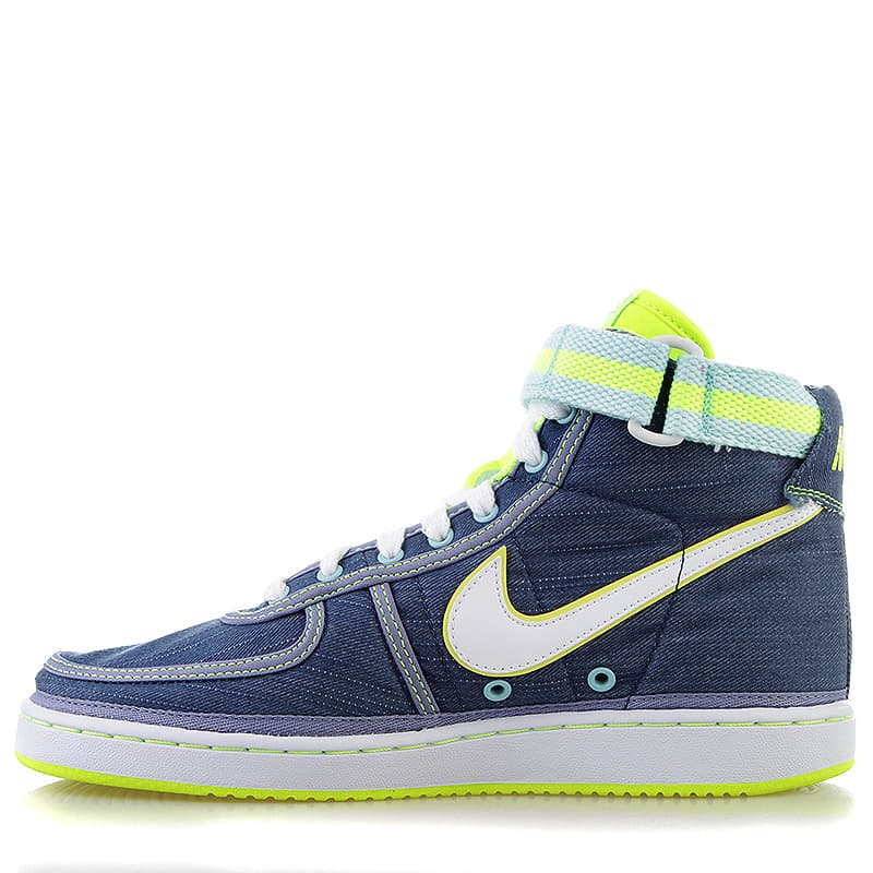 Сочетание неоновых 80-х с классическим ретро-стилем, Vandal High Supreme VNTG в джинсовой расцветке New Slate были выпущены как часть "джинсового набора" Nike 2014 года. От пятки до носка обувь с высоким верхом выполнена из текстильного джинсового материала. Светло-голубой оттенок "Ice" украшает задники, ремешок на щиколотке и фирменный знак Nike на язычке, а культовый оттенок "Volt" украшает накладки вдоль носка, крыла и середины стопы, а также язычок, Swoosh и подошву яркого цвета.- Цвета: New Stlate/White-Ice-Volt