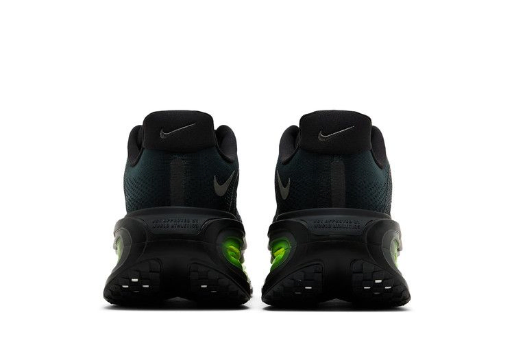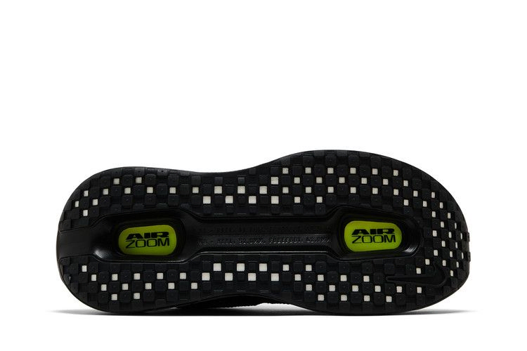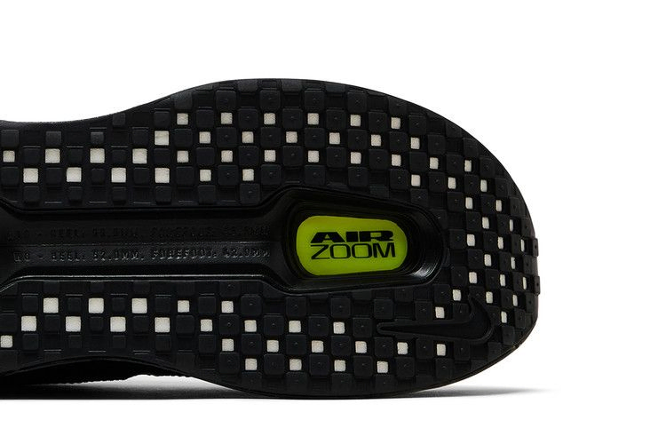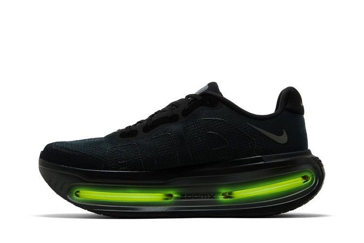 Модель Nike Vomero Premium "Black Anthracite" одета в черную сетчатую конструкцию, украшенную темно-серым логотипом Swoosh и надписью AIR, выполненной тональным шрифтом. Кроссовки опираются на черную промежуточную подошву ZoomX из вспененного материала высотой 55 мм с зелеными воздушными блоками Zoom Air в носочной и пяточной частях. При каждом шаге воздушные подушечки свободно расширяются и сжимаются, обеспечивая возврат энергии и прилив сил.