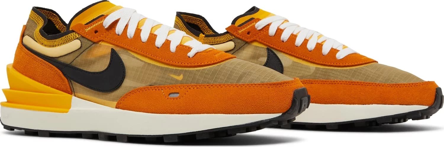Модель Nike Waffle One SE "University Gold Sunset" сочетает в себе традиционный стиль бега и современные детали. Верхняя часть выполнена из желтого полупрозрачного текстиля с черным кожаным логотипом Swoosh и оранжевыми замшевыми накладками на носке и пятке. Деконструированный воротник и тонкий эргономичный язычок обеспечивают удобную посадку. Выраженная стойка пятки из TPU встроена в заднюю часть полноразмерной промежуточной подошвы из EVA, выполненной в классической клиновидной форме и поддерживаемой резиновой подошвой с вафельным протектором.- Модель: Nike Waffle One