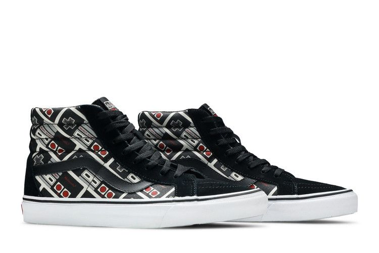 Модель Nintendo x Sk8-Hi Reissue 'Controller' имеет холщовый верх с принтом контроллера от первой домашней консоли Nintendo, выпущенной за пределами Японии, Nintendo Entertainment System (NES). Дизайн дополнен мягким воротником, черной кожаной полосой в стиле джаз и черной замшей на носке, заднике и пятке. Модель стоит на белой вулканизированной подошве, а на черной вафельной подошве красуется надпись "Game Over!".