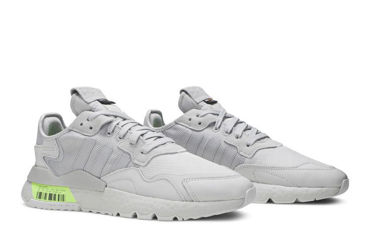 Модель adidas Nite Jogger 'Signal Green' отличается прочной конструкцией, в которой традиционная сетка заменена на нейлон Cordura нейтрального серого оттенка. Накладки из кожи и замши продолжают серую тему, а светоотражающие детали на пятке обеспечивают дополнительную видимость в условиях недостаточной освещенности. Серую промежуточную подошву Boost подчеркивает сигнально-зеленый цвет на боковой стороне кроссовка, выделяя штрих-код и заводской брендинг.