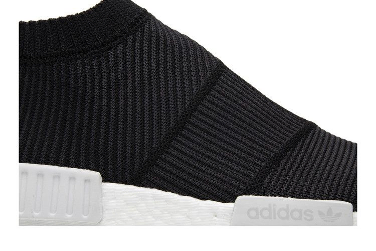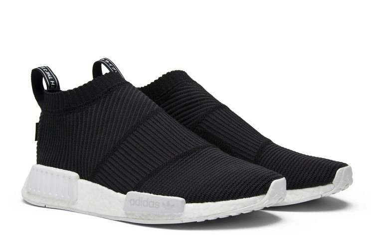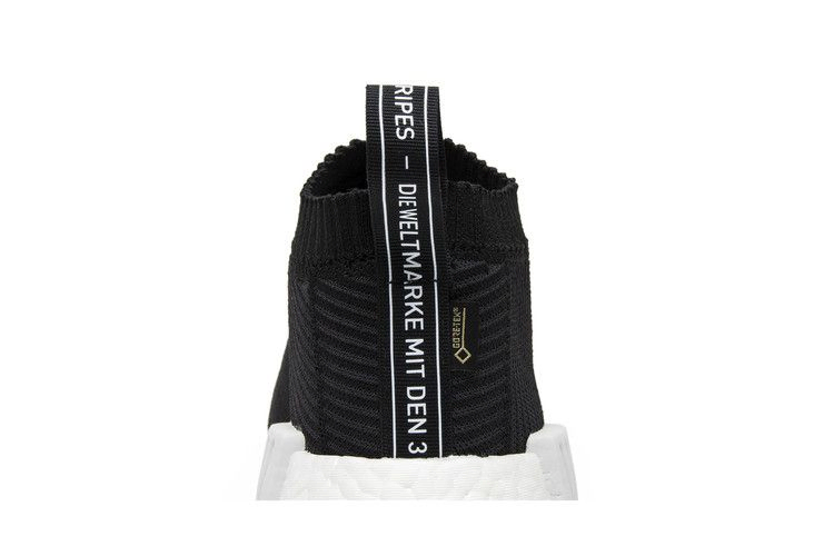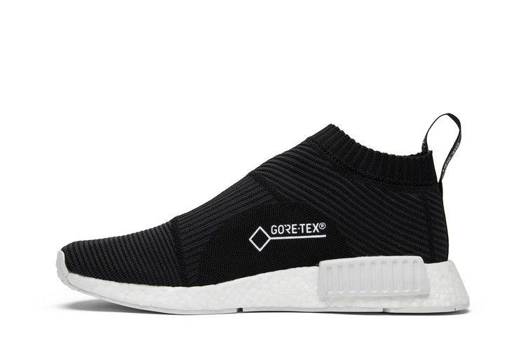 NMD_CS1 Primeknit Gore-Tex - это футуристические слипоны с носками, черным верхом Primeknit без лацканов и полностью водонепроницаемой подкладкой Gore-Tex, а также амортизацией Boost, белой формованной подошвой EVA и белой резиновой подошвой с переплетением.