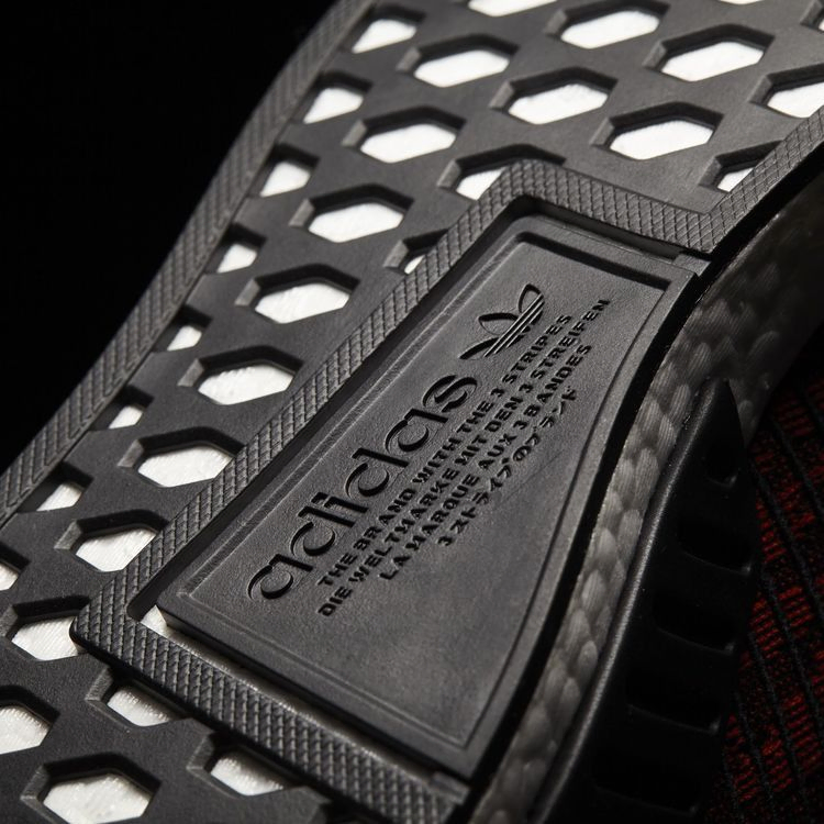 Модель NMD_CS2 Primeknit "Red Glitch" без лацканов, с эластичным манжетом на лодыжке. Верх из черного праймернита Future Harvest с узором в виде глитча и вышитыми черными деталями. У кроссовок также черные вставки на пятке NMD, белая промежуточная подошва Boost, черный бампер EVA на медиальной стороне и черная резиновая подошва.