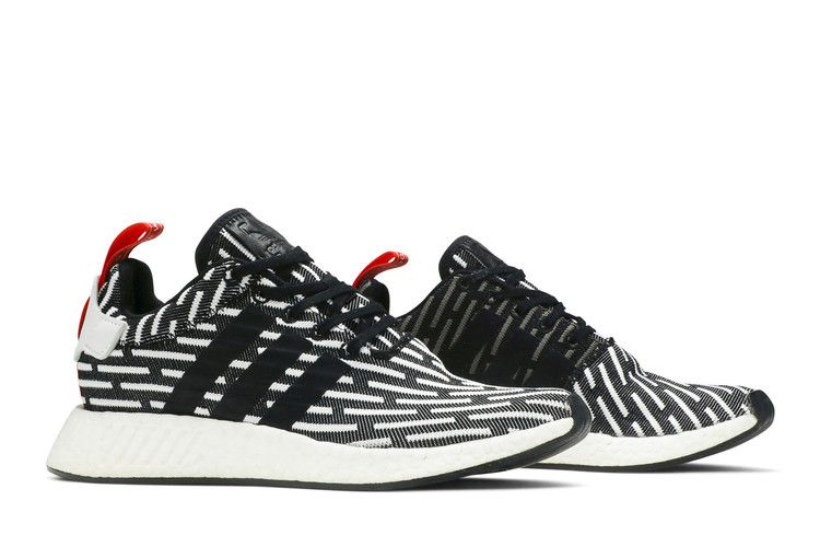 Модель NMD_R2 PK 'Core Black Stripe' имеет черный верх с узором в виде белых полос, черную полосу 3-Stripe, белую накладку на пятке из нубука и красную пятку. Кроссовки также оснащены красной медиальной заглушкой, белой промежуточной подошвой Boost и черной подошвой. Модель Core Black Stripe была выпущена в апреле 2017 года вместе с семью другими расцветками NMD.