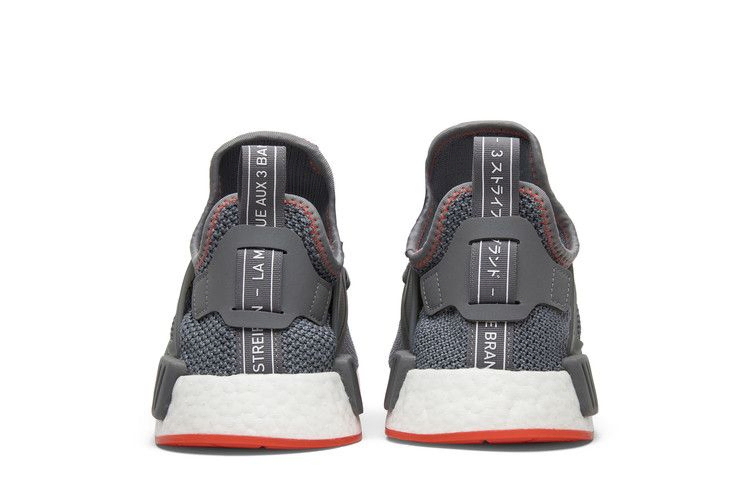 Сдержанная нейтральная расцветка adidas NMD XR1 получила тонкий всплеск благодаря неброским акцентам Solar Red, которые появились на полупрозрачной резиновой подошве и контрастной строчке, опоясывающей язычок и воротник. Кроме белой промежуточной подошвы Boost, остальная часть кроссовок выполнена в сером цвете.