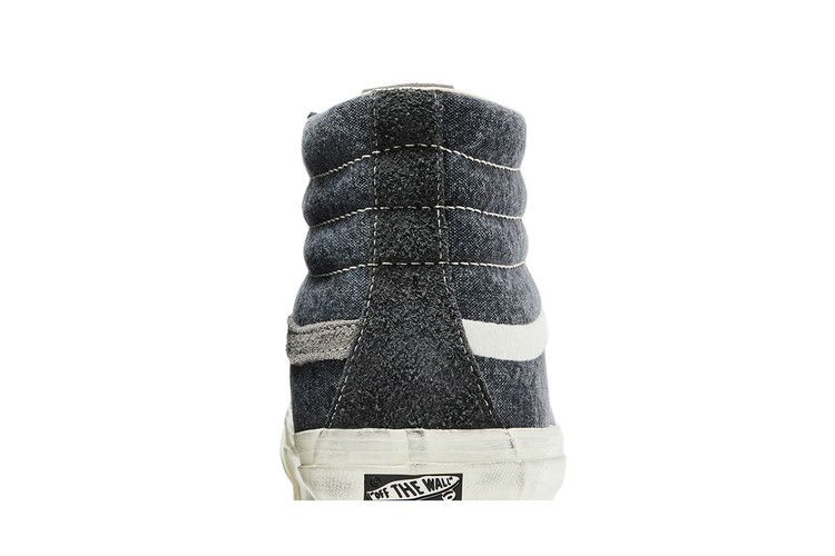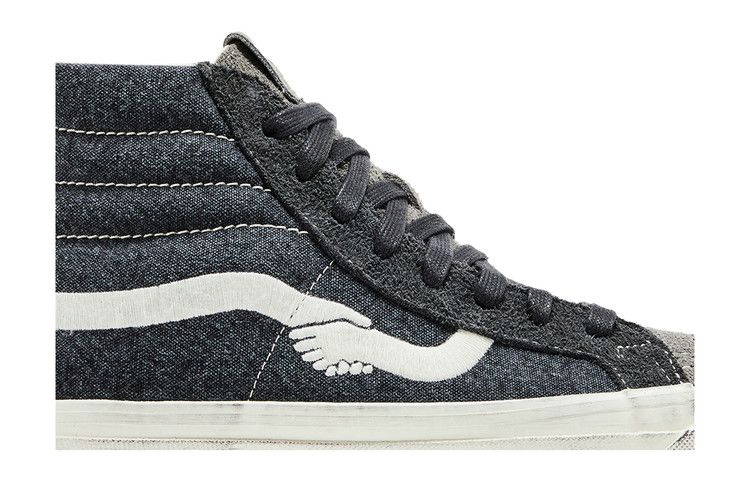 Верхняя часть Notre x Vans Sk8-Hi Reissue 'Raven' сочетает в себе угольный канвас и серую замшу на носке и язычке. Фирменный мотив рукопожатия Notre интегрирован в боковую полосу из белой кожи, а двойной брендинг вытиснен на язычке из серой замши. Модель опирается на предварительно поджатую белую промежуточную подошву, укрепленную высокими резиновыми набойками и поддерживаемую подошвой из резины с вафельным рисунком.