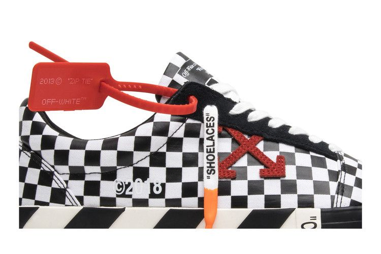 Итальянский бренд уличной и люксовой моды OFF-WHITE продолжает переосмысливать значение низких кроссовок для игры вне корта. Модель OFF-WHITE Vulc Low Top, разработанная Вирджилом Аблохом, имеет верх из черно-белой клетчатой и перфорированной кожи с черными замшевыми деталями, фирменные стрелки на боковой панели, надпись "OFF" на средней подошве и приклеенный логотип на язычке. Кроме того, на верхних люверсах красная молния и надпись "SHOELACES" на шнурках.