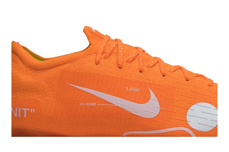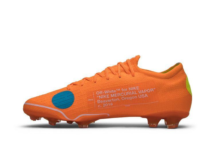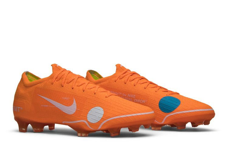 Футбольные бутсы Off-White x Mercurial Vapor 360, выпущенные в марте 2018 года, - это переосмысление Вирджилом Аблохом линии футбольных бутс Mercurial от Nike. Бутсы одеты в оранжевый микротекстурированный верх Flyknit с большими синими и белыми точками, обозначающими оптимальные зоны удара, и имеют фирменный бренд Аблоха на медиальной стороне. Другие детали включают логотип Swoosh на боковой стороне, слово "LOGO" и некоторые размеры, а также надпись "KNIT" на пятке.