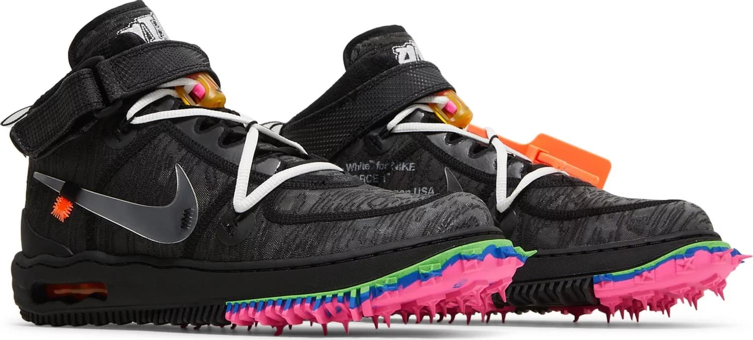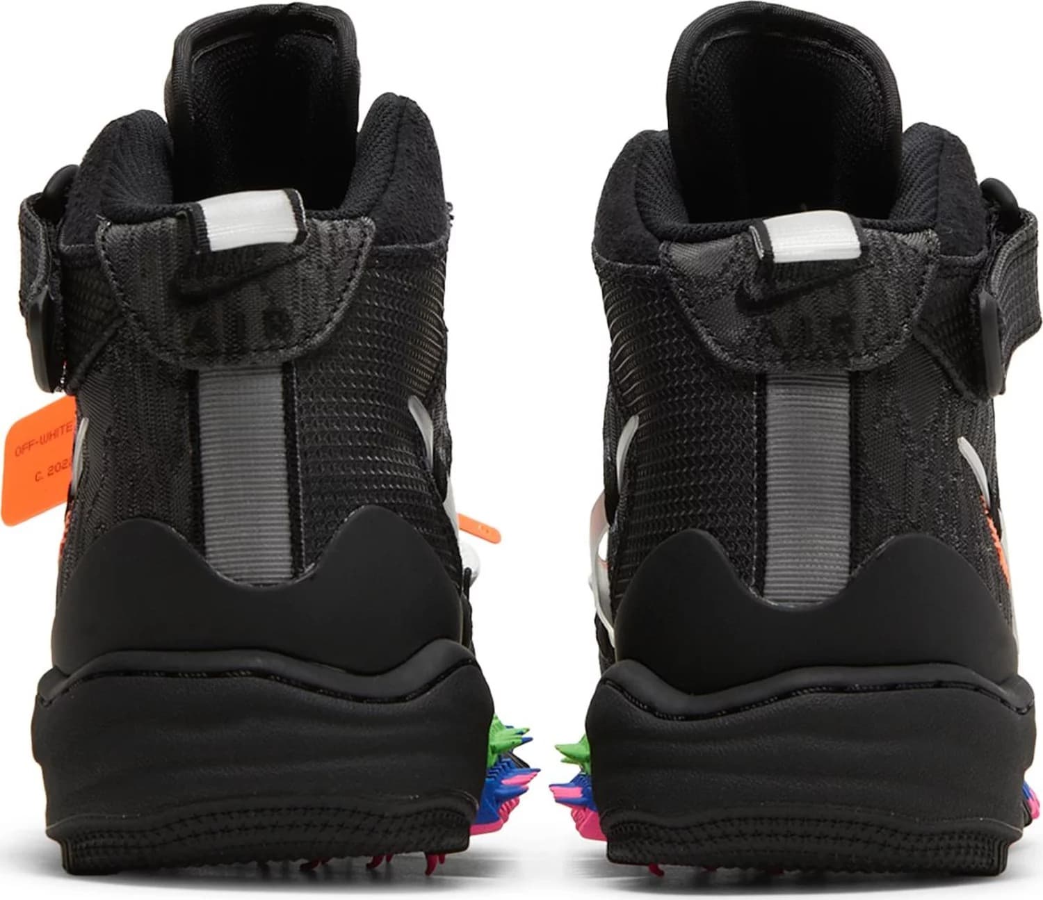 Кроссовки Off-White x Nike Air Force 1 Mid 'Black' демонстрируют комплексное обновление, подчеркнутое черным текстильным верхом с тональными деталями. Верхняя часть кроссовок фиксируется регулируемым ремешком на щиколотке и традиционными шнурками, дополненными шнурками с розовыми и желтыми замками. Уникальные элементы брендинга включают полупрозрачные Swooshes, язычок в стиле граффити "AIR" и фирменные строчки Off-White в виде текста Helvetica на медиальной стороне. Соответствующая черная мидсоль имеет волнистый верхний край и видимый оранжевый блок Air-sole в пятке. Подошва дополнена разноцветными шипами под носком.- Цвета: Black/Clear/Black