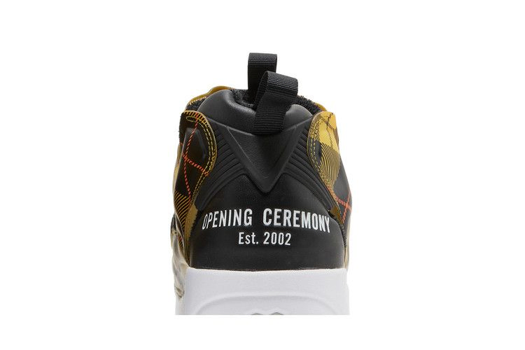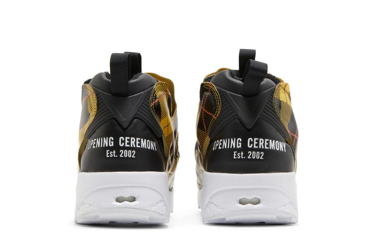 Модель Opening Ceremony x Reebok InstaPump Fury OG 'Yellow Plaid', созданная в сотрудничестве с многогранным модным брендом, заменяет традиционную сетчатую конструкцию на текстиль с экстравагантным узором. Надувная клетка, обеспечивающая индивидуальную посадку кроссовка, выполнена в желто-черной клетчатой расцветке, а основные черные цвета выделяют кожаные накладки на носке и пятке. На последней имеется надпись "Opening Ceremony Est. 2002".