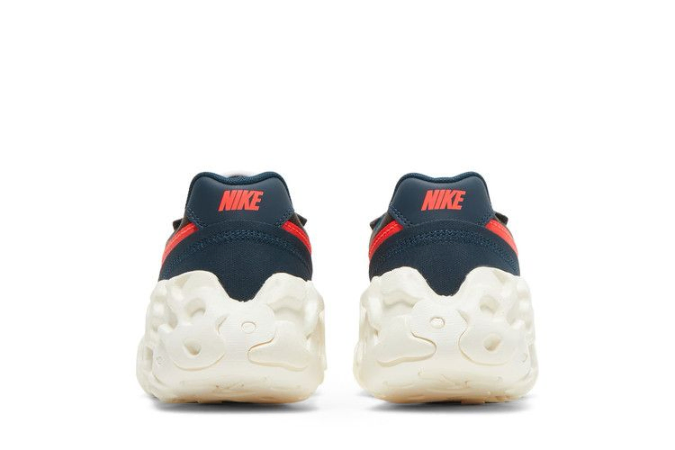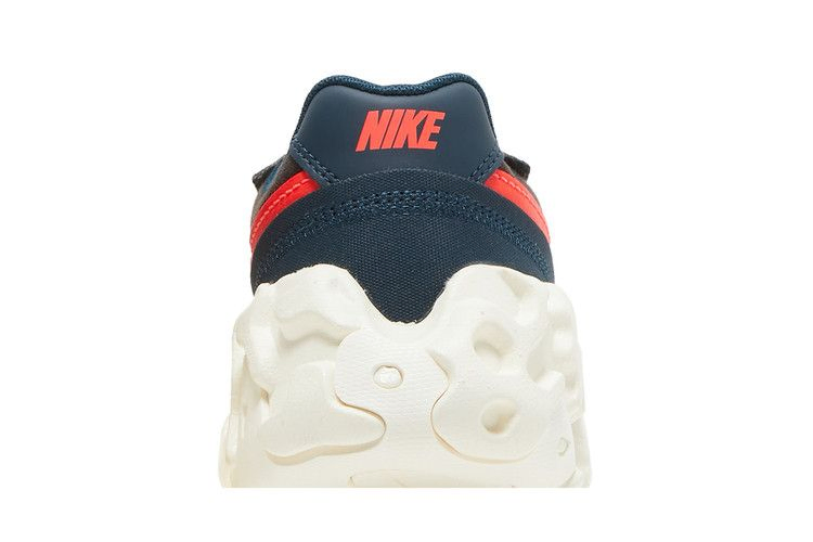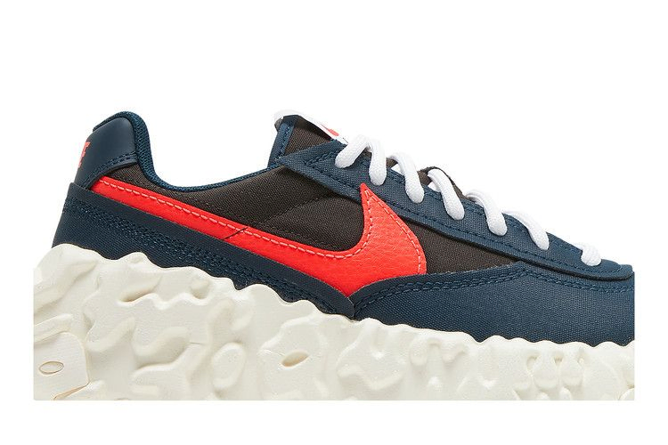 Модель Nike Overbreak SP "Armory Navy" представляет собой силуэт в стиле ретро, сочетающий в себе традиционный стиль бега и экспериментальные авангардные технологии. Текстильный верх выполнен в контрастных темно-синих и коричневых тонах с алым свушем из кожи. Дополнительные элементы брендинга включают знак Nike на задней вкладке и тканую метку Nike Overbreak на язычке. Кроссовки установлены на выразительную промежуточную подошву OverReact с белой отделкой.