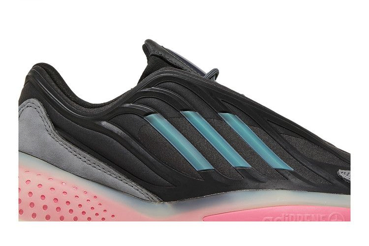 Модель adidas Ozrah 'Black Rose Tone' имеет контрастные акценты на прогрессивном силуэте с деталями, вдохновленными ретро. Верхняя часть выполнена из черного текстиля с тональным каркасом из TPU и серыми замшевыми накладками на носке и пятке. Плавающие трехполосные полосы выполнены в цвете Hazy Green, а контрастные розовые акценты расположены на промежуточной подошве Adiprene+, обтянутой полупрозрачной резиновой обоймой. Вдоль пятки тянется вставка из резиновых трубок, напоминающая о adidas Ozweego.