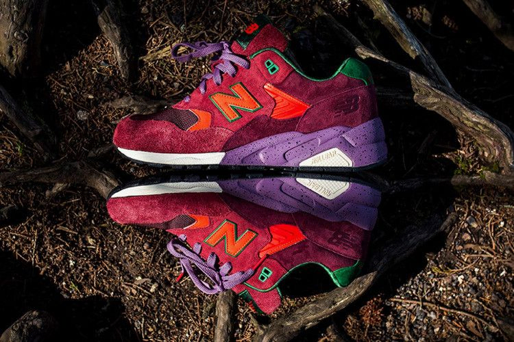 Модель New Balance 580, созданная в унисон с коллекцией Jersey Devil от Packer Shoes, ссылается на фольклорную историю 1700-х годов о чудовище, которое бродит по лесам этого региона и враждует с теми, кто в них заходит. Накладки из ворсистой замши символизируют само существо, а логотип на языке и стелька украшены изображением соснового леса, в котором оно обитает. Кроме того, обувь имеет атласную подкладку носков, пятнистую промежуточную подошву и светоотражающие акценты 3M.