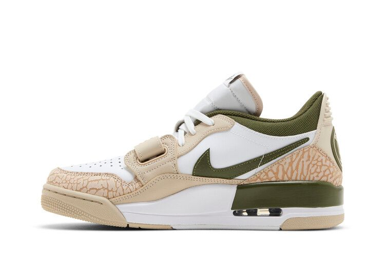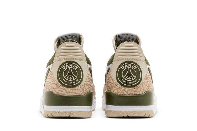 Модель Paris Saint-Germain x Jordan Legacy 312 Low "Fourth Kit" выполнена в нейтральных земляных тонах, вдохновленных последней футболкой футбольного клуба в сезоне 2023-2024 годов. Гибридный силуэт выполнен из белой кожи, застегивается регулируемым ремешком в средней части стопы и дополнен накладками с принтом слона на носке и пятке. Оливково-зеленые акценты расставлены на фирменном логотипе Swoosh, подкладке воротника и язычке Wings. Брендинг ПСЖ украшает заднюю часть пятки и носок. Легкая амортизация обеспечивается полиуретановой подошвой с видимым блоком Air-sole в пятке.