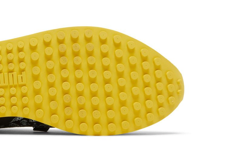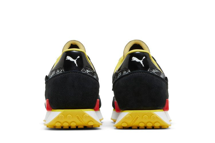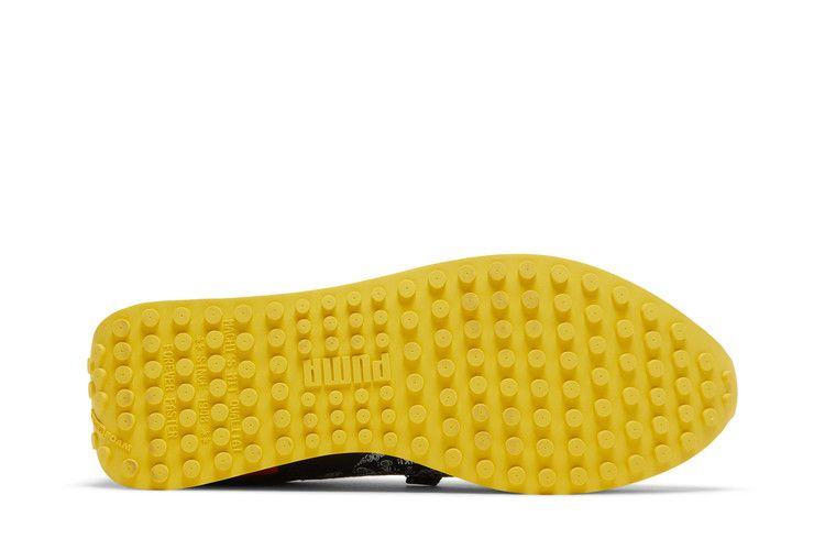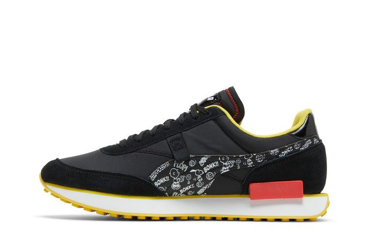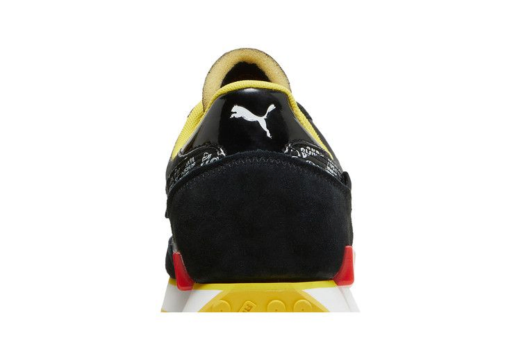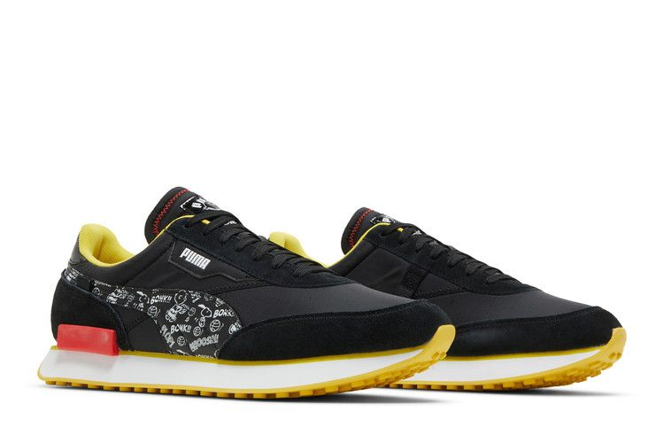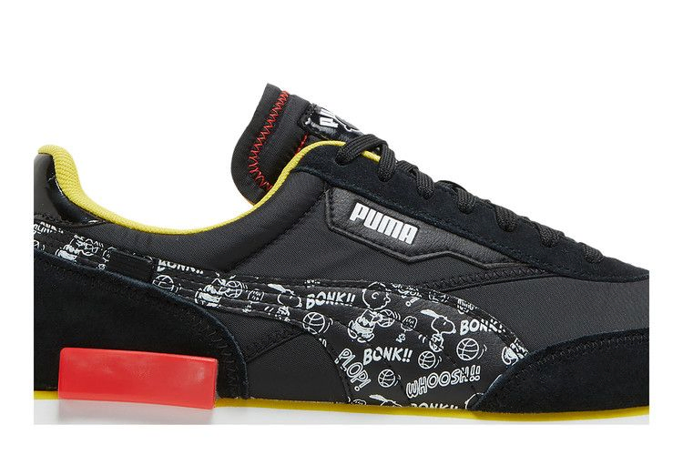 Модель Peanuts x PUMA Future Rider "Comic Strips", выпущенная в рамках капсульной коллекции, посвященной красочной банде Чарльза М. Шульца, имеет верх из черного нейлона с тональными замшевыми накладками на носке и пятке. Черная кожаная подошва украшена иллюстрациями с изображением Чарли Брауна и Снупи, а также такими выразительными звуками из комиксов, как "Bonk!!!" и "Woosh!!!". Контрастные цветовые акценты привносит красная промежуточная подошва из TPU и горчично-желтые детали на подкладке воротника и резиновой подошве Federbein.