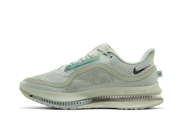 Модель Nike Pegasus Premium "Jade Horizon" выполнена из кругового трикотажа бледно-зеленого оттенка с волнистой тональной накладкой со светоотражающей отделкой, призванной ловить свет. Легкая конструкция усилена в латеральной и медиальной частях передней части стопы, а динамическая система фиксации стопы обеспечивает плотную посадку. Модель установлена на отзывчивую межподошву из пеноматериала ZoomX, дополненную по всей длине контурным блоком Zoom Air и слоем пеноматериала ReactX под пяткой.
