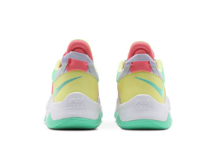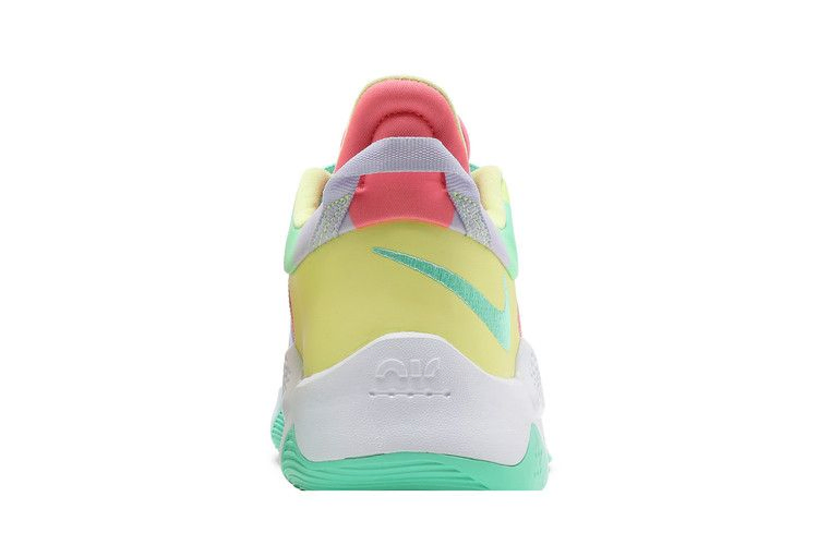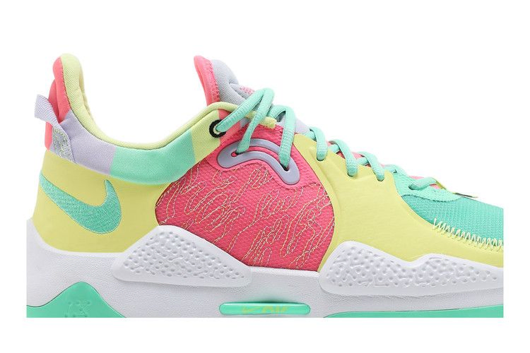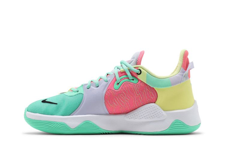Верхняя часть Nike PG 5 "Daughters" выполнена из смеси сетки, текстиля и синтетических материалов в пастельных тонах. Нежная палитра вдохновлена дочерью Пола Джорджа, которая любит рисовать картины для своего отца, и дополнена сочетанием зеленого, лавандового, желтого и кораллового оттенков. С точки зрения производительности, низкие кроссовки Nike Air Strobel обеспечивают гибкую амортизацию и плавный переход между двумя сторонами площадки. Резиновая подошва с разнонаправленным протектором обеспечивает сцепление с поверхностью.