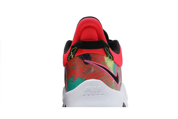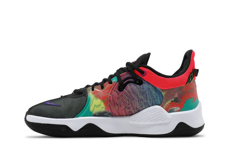 Nike PG 5 "Multi-Color" - это пятые фирменные кроссовки Пола Джорджа с привлекательным дизайном, напоминающим тепловые карты. Низкие кроссовки выполнены из зеленой и черной сетки на заднике и ярко-красного текстиля на мягком воротнике. Остальная часть верха покрыта вихревым спектром цветов, среди которых преобладают огненно-красные, оранжевые и желтые оттенки с более холодными вкраплениями тила и темно-синего. К преимуществам кроссовок можно отнести полноразмерный штрих Nike Air, пришитый непосредственно к верху, и прочную резиновую подошву, обеспечивающую надежное сцепление с поверхностью во всех направлениях.
