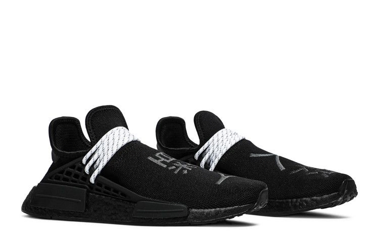 Модель Pharrell x adidas NMD Human Race 'Black', выпущенная в рамках большой коллекции с многогранным художником, обновляет беговые кроссовки с незаметной отделкой верха из материала Primeknit и полноразмерной промежуточной подошвой Boost. Минималистичная конструкция дополнена декоративными шнурками и язычком из искусственной кожи на пятке, украшенным трилистником adidas. На заднике вышита крупная японская надпись "Human Race".
