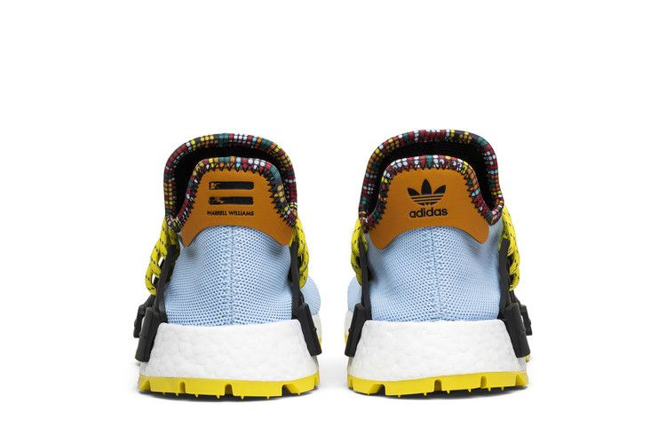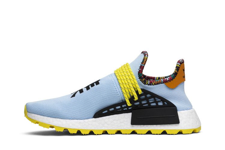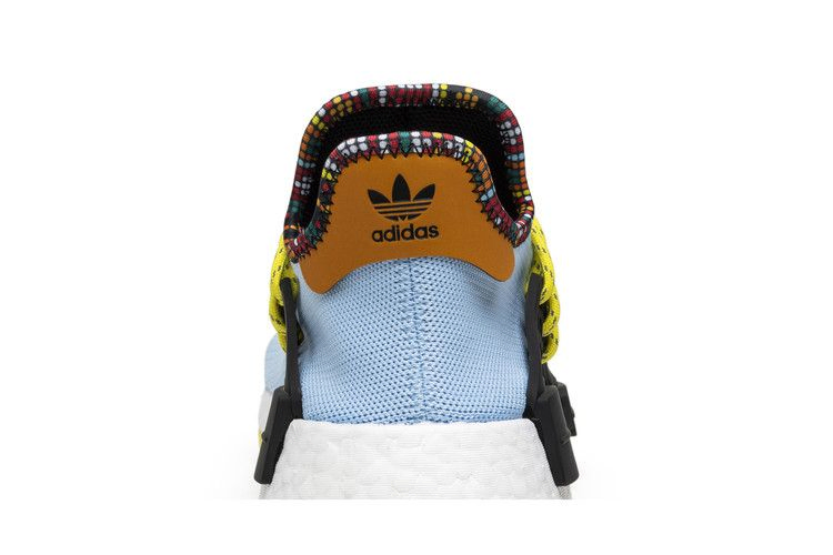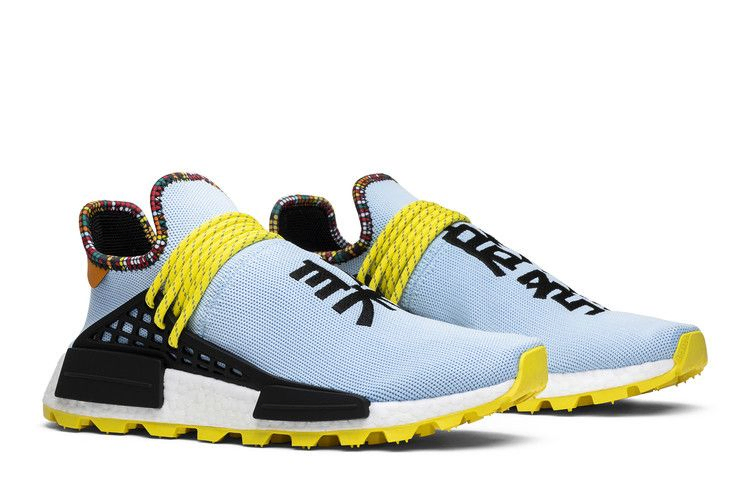 Все четыре пары, вошедшие в комплект Pharrell x NMD Human Race 'Inspiration Pack', отличаются контрастными цветами и минималистичной конструкцией, в которой дышащий верх из материала Primeknit расположен на полноразмерной промежуточной подошве Boost и подошве с высоким коэффициентом сцепления. В данном случае трикотажная конструкция выполнена в сдержанном оттенке Clear Sky и дополнена желтыми шнурками и разноцветным узором вокруг воротника. Черные оттенки присутствуют на литом каркасе шнурков и китайских надписях на заднике.