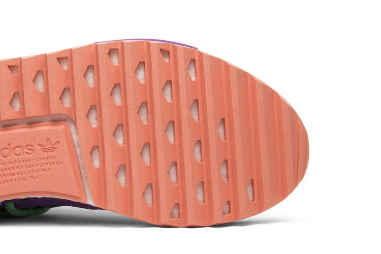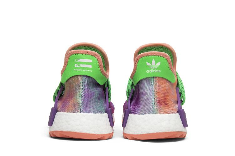 В пакете Pharrell Williams x adidas Originals NMD Hu Trail "Holi Festival" представлены три цветовых решения, вдохновленные индийским фестивалем красок Холи. Эта модель имеет разноцветный верх, подчеркнутый ярко-зеленым на шнурках, пятке и внутренней подкладке. На правой верхней части кроссовка вышита белая надпись "HU", а на левой - соответствующий текст на языке деванагари. Другие детали включают фиолетовую клетку для шнурков с соответствующими накладками из EVA, белую промежуточную подошву Boost и зубчатую подошву Chalk Coral.