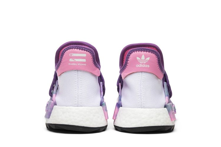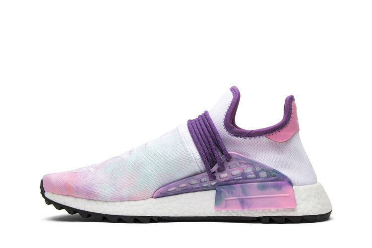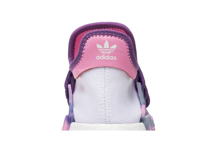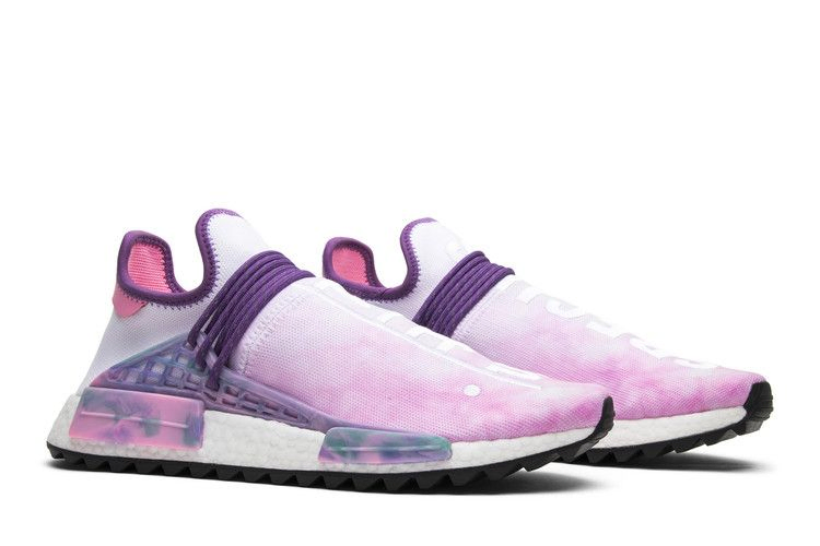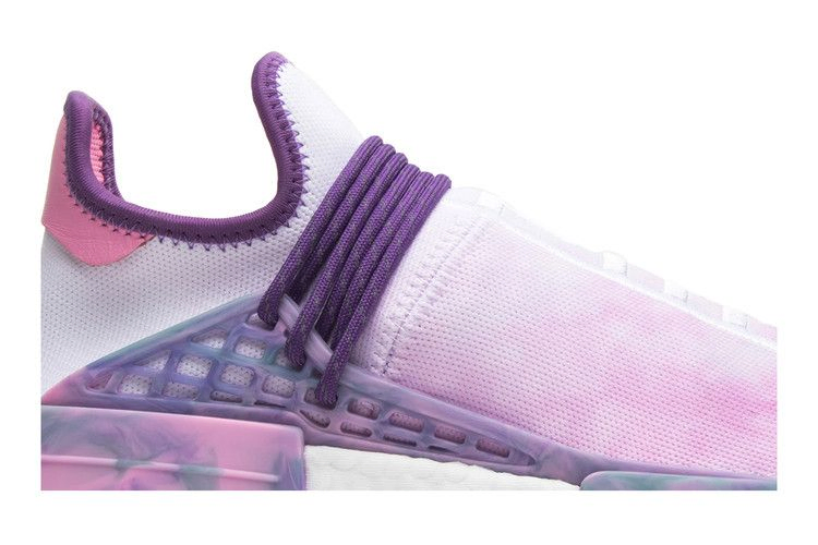 Pharrell Williams x adidas Originals NMD Hu Trail 'Holi Festival' предлагает три цветовых решения, вдохновленные индийским фестивалем красок Холи. Эта модель имеет верхнюю часть цвета Pink Glow, украшенную фиолетовыми шнурками Lab Purple, TPU шнуровкой и пяточным воротником. Слово "SPECIES" вышито белым цветом на верхней части левого ботинка, а на правом ботинке выгравирован текст на языке деванагари. Другие особенности включают белую промежуточную подошву Boost и черную зубчатую подошву.