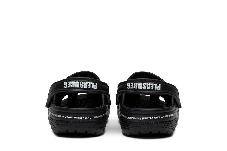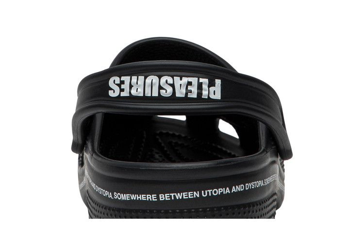 Представленная в августе 2019 года модель Pleasures x Crocs Clog 'Utopia Dystopia' черпает вдохновение в таких предметах кастомизации молодежной субкультуры, как кожаные куртки и рюкзаки. Черный верх сандалий украшен брелоками Jibbitz, демонстрирующими мотивы из архива бренда. Другие графические элементы включают брендинг вдоль ремешка на заднике и надпись "SOMEWHERE BETWEEN UTOPIA AND DYSTOPIA" белым шрифтом вокруг межподошвы.