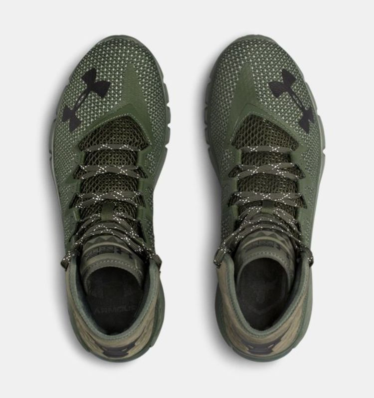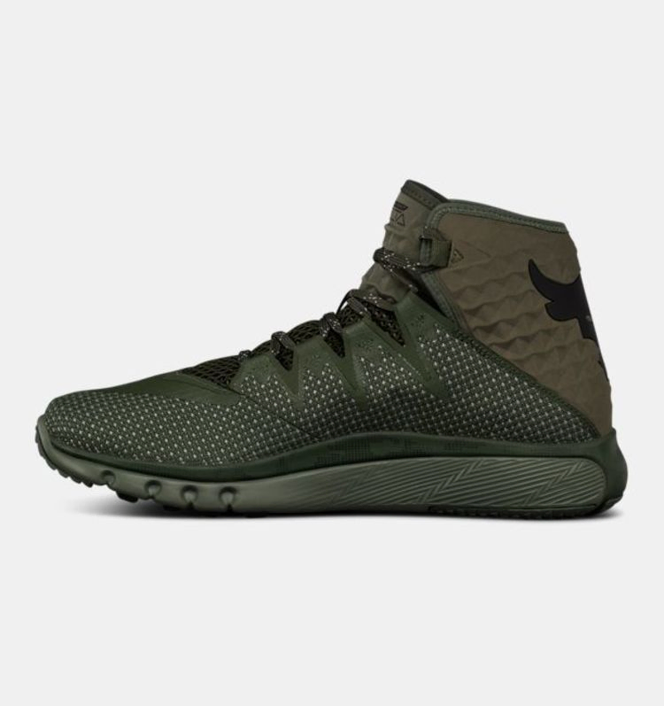Модель Under Armour Project Rock Delta, одобренная Скалой в 2017 году, дебютировала в трех цветовых вариантах, включая этот "Downtown Green". Покрытые камуфляжным принтом, кроссовки выполнены из дышащей сетки с бесшовной конструкцией и поддерживающим голеностоп воротником. Под ногами находится соответствующая промежуточная подошва с амортизацией Charged Cushioning, а подошва из твердой резины обеспечивает повышенную гибкость благодаря глубоким гибким канавкам.
