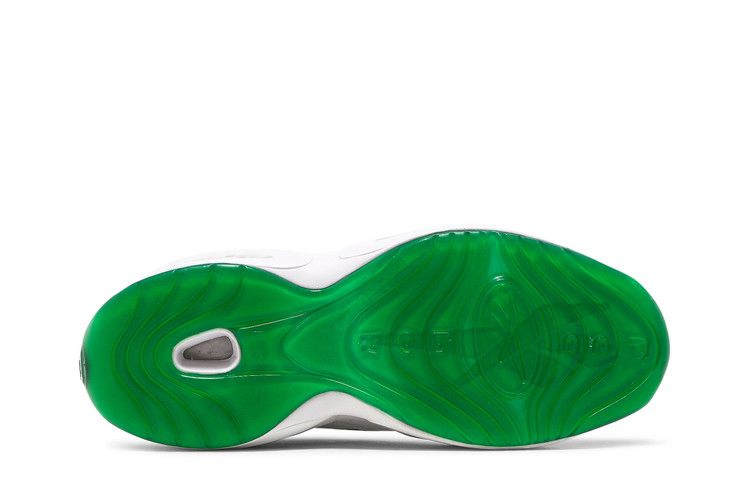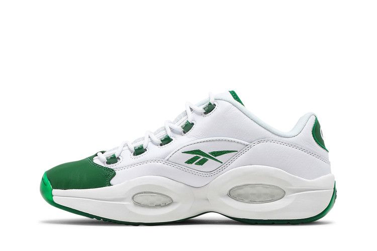 Модель Reebok Question Low "Green Toe" возрождает простую двухцветную расцветку, первоначально выпущенную в 2006 году. Вдохновленные знаменитой франшизой Boston Celtics, фирменные кроссовки Аллена Айверсона одеты в белую кожу с контрастной кожаной крышкой носка цвета Glen Green. Этот же оттенок повторяется на различных брендинговых элементах кроссовка, а также на пластиковых петлях для шнурков и полупрозрачной резиновой подошве. Кроссовки стоят на легкой промежуточной подошве из ЭВА с ретро-подушкой Hexalite в пятке и передней части стопы.